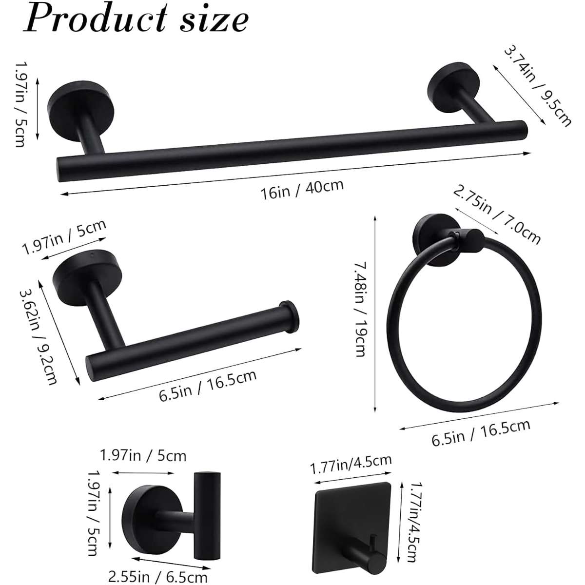 14 Pieces Combination - 2 x 16 inches towel bar, 2 x Toilet paper holder, 2 x Towel ring, 4 x Robe & towel hooks, 4 x Adhesive hooks.