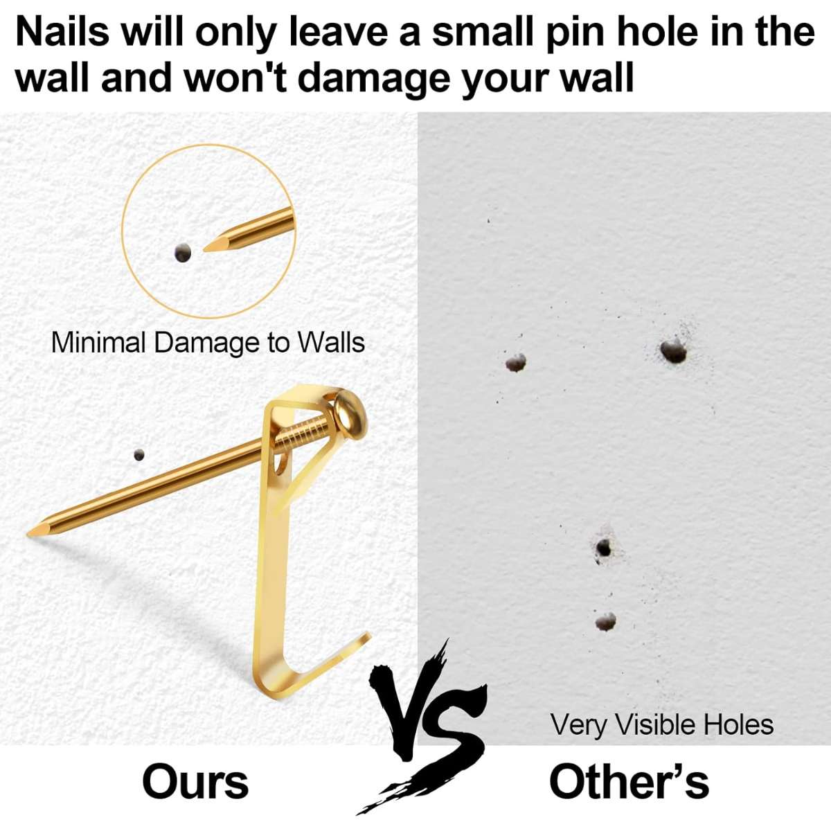 Reliable thickness: The body of the Picture Hanging Kit is thickened, and more durable. If the wall is hard enough, hanging something light will work well. Nails are not easy to bend, and easy to hang clutter firmly on the wall. The picture hangers are small and practical, and it is easy to recycle, leaving a small hole.