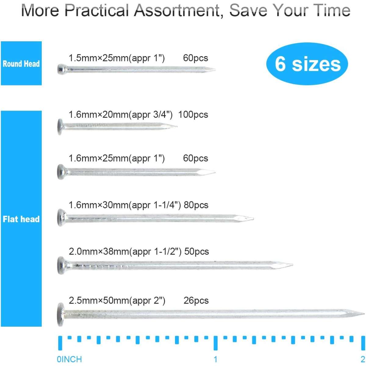 【Various Size】 A kit includes plenty of sizes of hardware nails, 1.6mm * 20mm(appr 3/4”), 1.6mm * 25 mm(appr 1”), 1.6mm * 30 mm(appr 1-1/4”), 2mm * 38 mm(appr 1-1/2”), 2.5mm * 50 mm(appr 2”), 1.5mm * 25 mm(appr 1”). With 376 nails in every kit, suitable for your diverse projects.