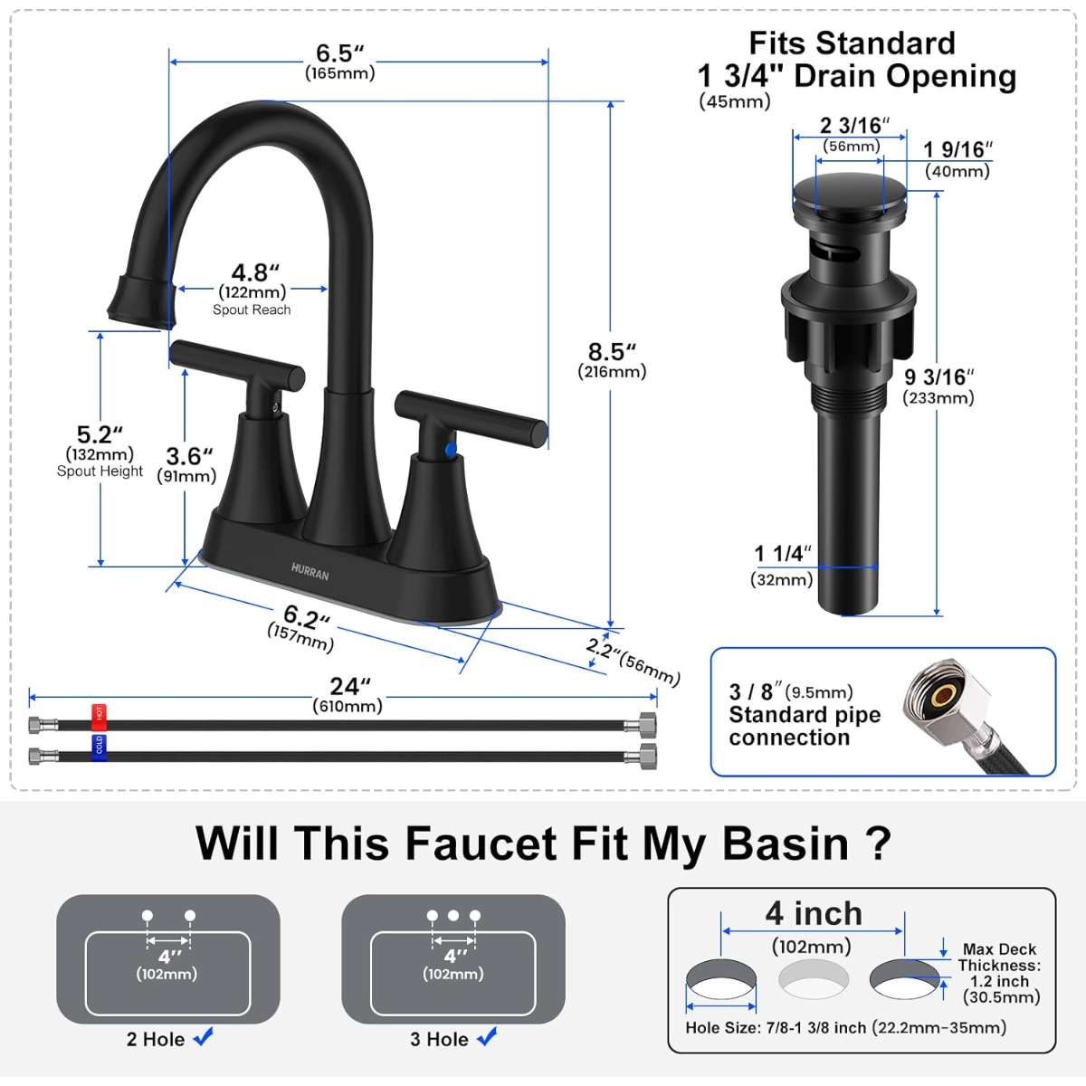 🔧EASY INSTALLATION IN 15 MINS: 4 inch centerset american standard design bathroom faucets for sink 3 hole or counters, you can install this bathroom sink faucet in 4 steps-15 mins with confidence. Eliminates the need for plumber, saving your both time and money. Mounting Hole Diameter:7/8-1 3/8 inch. Max. Deck Thickness:1.2 inch.