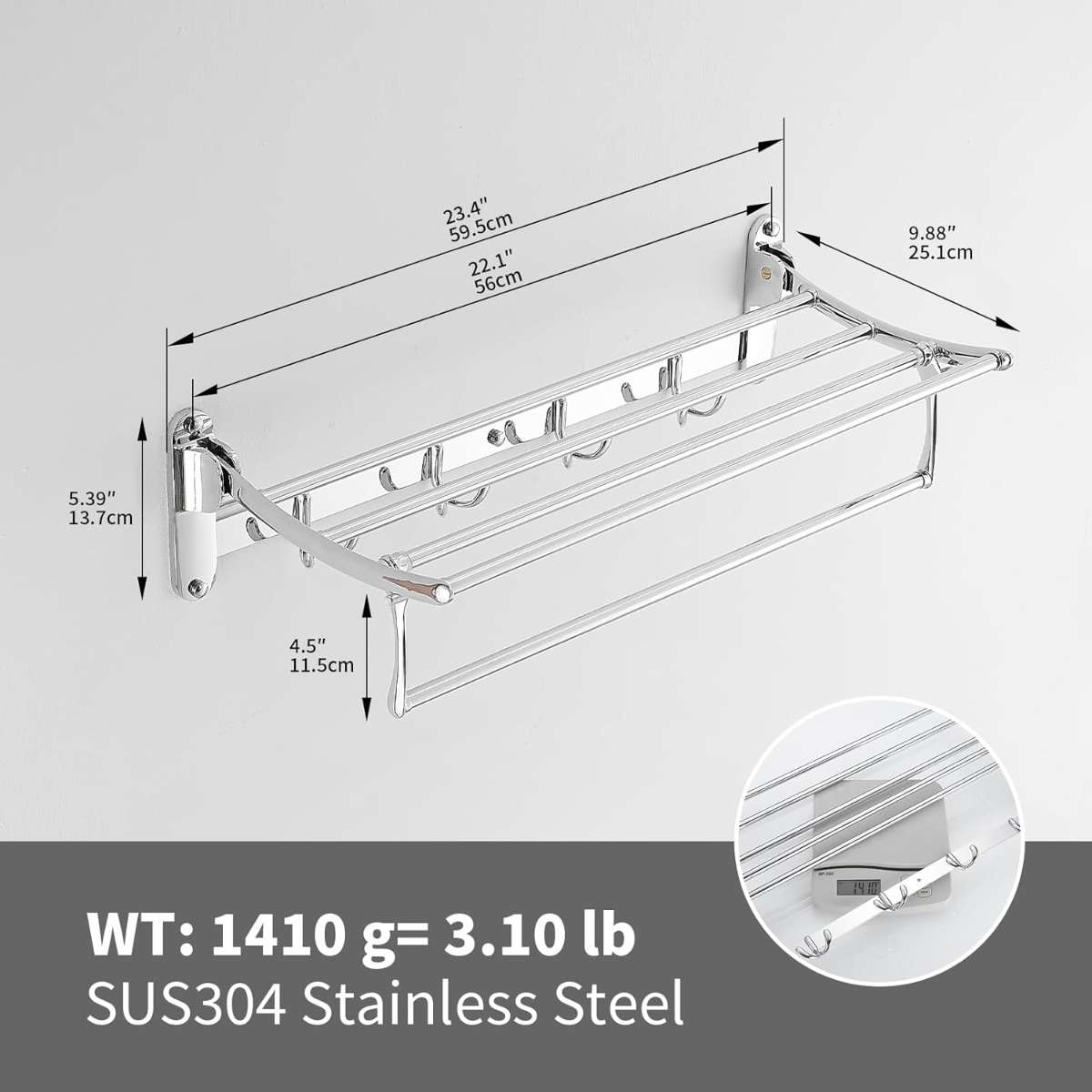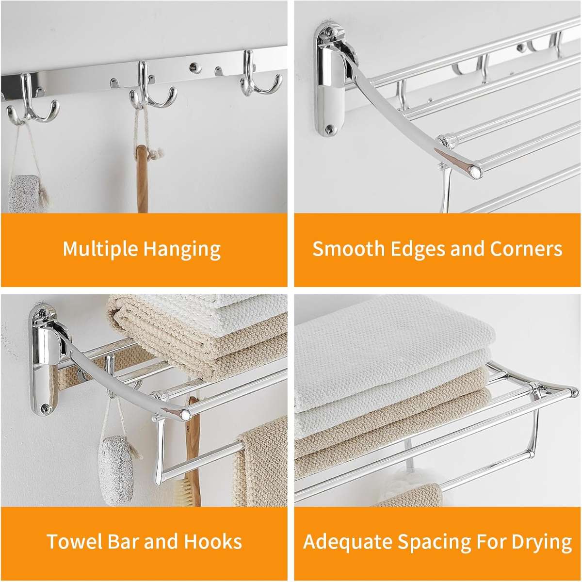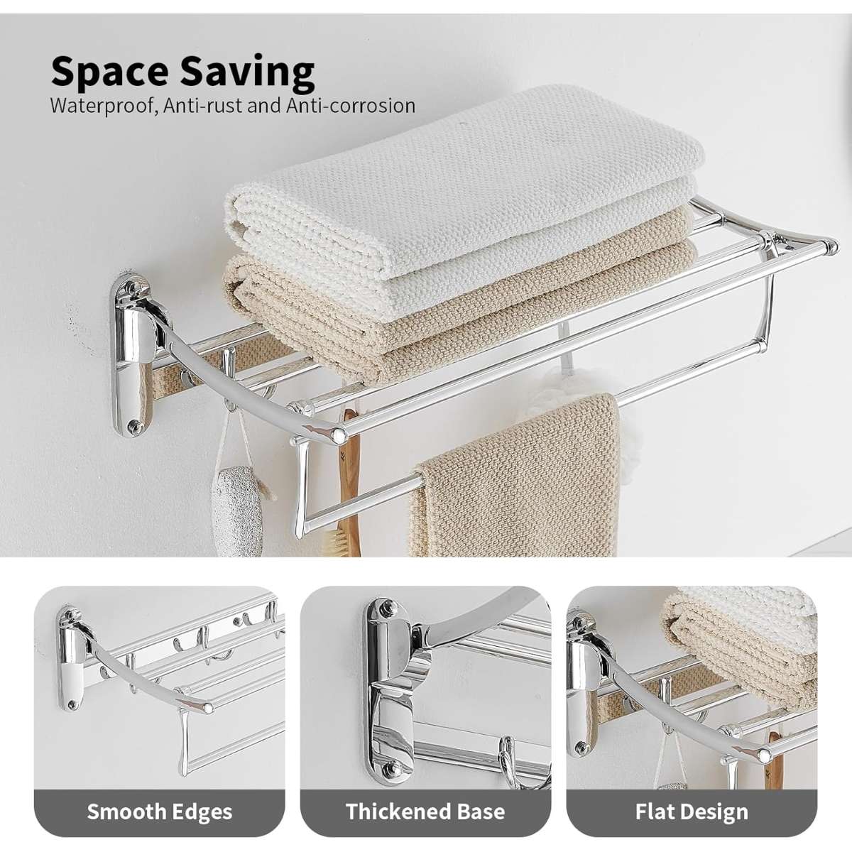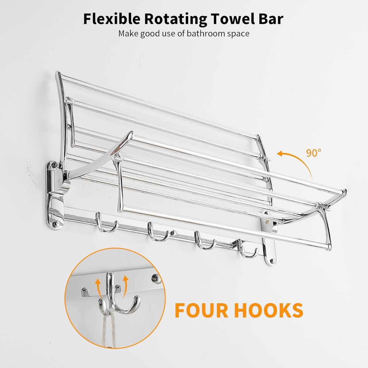 Multifunctional- Foldable towel shelf, Adjustable towel bar and 5 towel hooks, Ideal for use in bedrooms, bathrooms, and closets