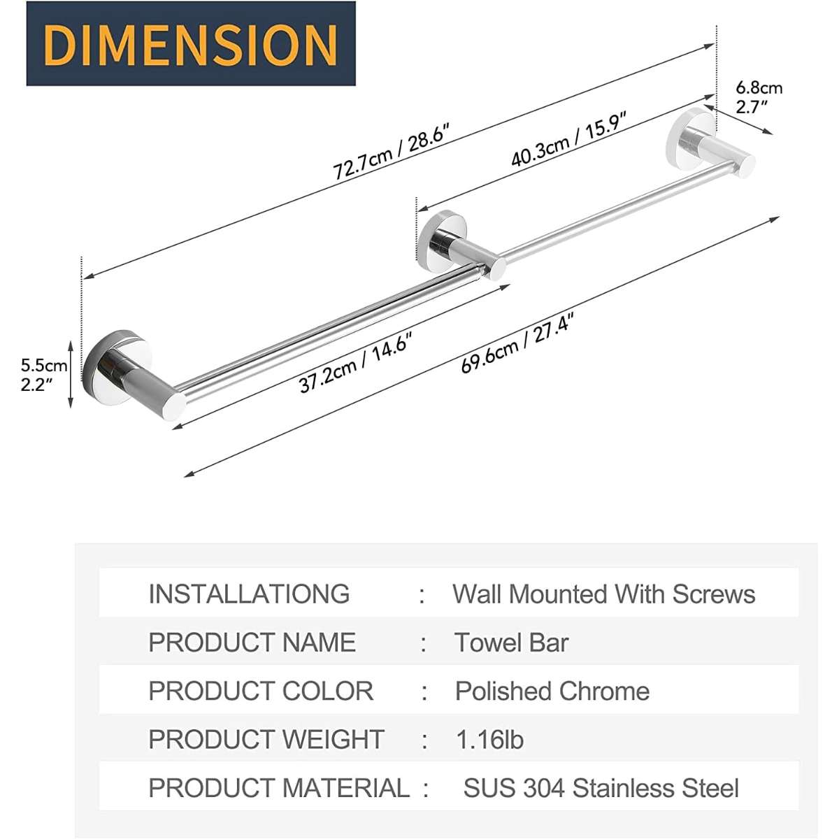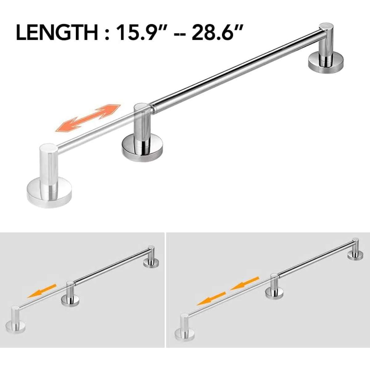 Retractable - Retractable towel bar from 15.9 Inch to 28.6 Inch, you can install it in any length if you wish, widespread use in bathroom, lavatory and washroom.