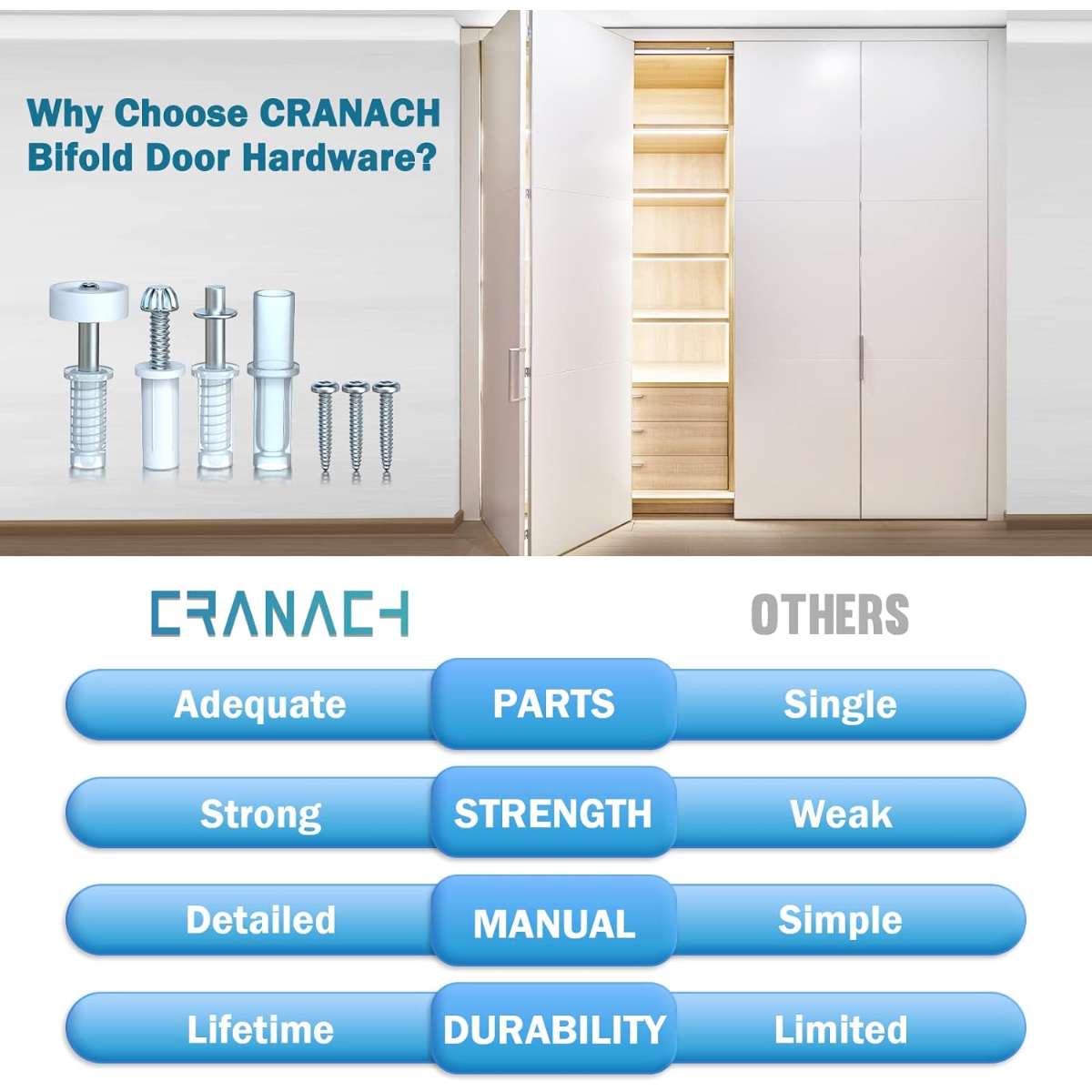 Easy to Install, Worked Well: When replacing the bifold closet door hardware kit, you hardly need to make any extra drilling, measuring, and other adjustments when you are changing the fittings. CRANACH pivots and guide wheels have their own springs, when they are fixed on the door hole, by pressing the built-in springs, the distance between the door and the track will be adjusted so that it can quickly enter the bracket and track, and the folding door can slide easily.