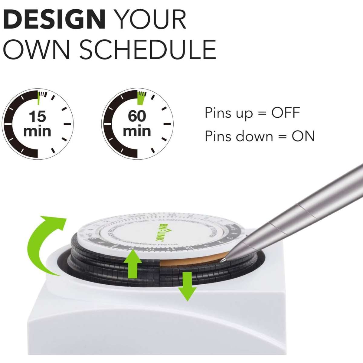 ✓ FULLY ADJUSTABLE: Simply press down all the pins for the range of time (15 minute to 24 hours) you would like your attached appliance to turn on. The programed schedule will repeat every 24 hours, automatically turning on and off your device. If you want timer switch always on, just flip the switch to the ‘On’ position to keep bypass the timer function.