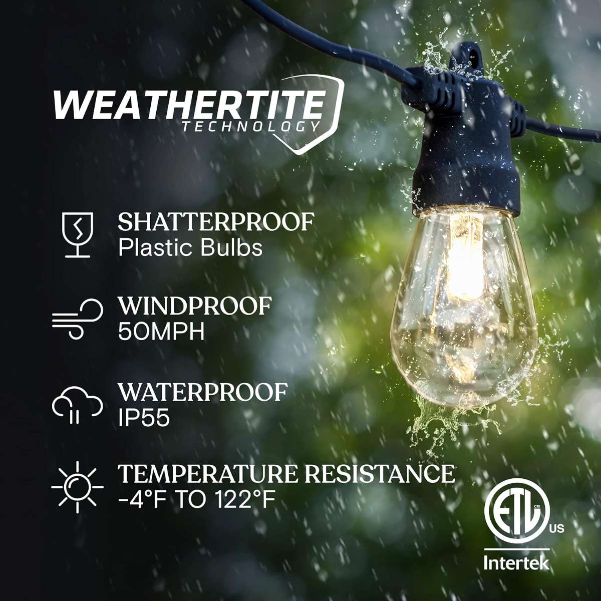 Commercial Grade WeatherProof Patio Lights with Shatterproof S14 Bulbs: Brightech’s Ambience Pros hanging string light has our WeatherTite technology - withstood winds up to 50MPH, rain & snow. The bulbs are shatterproof plastic shells, with heat resistance up to 122 degrees Fahrenheit. Flexible heavy-duty cord withstands the wear of indoor and outdoor use. Make your pergola, porch or other space to be an enticing, relaxing and soothing winter holiday retreat with Brightech LED outdoor lights.