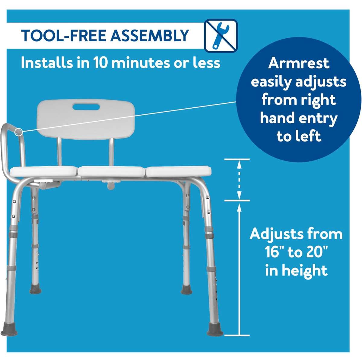 ADJUSTABLE SEAT HEIGHT makes it easy to level the bath bench to the perfect height, no tools required. The bath seat (or shower seat) disassembles quickly and easily for storage or travel so you'll never have to leave your comfort at home.