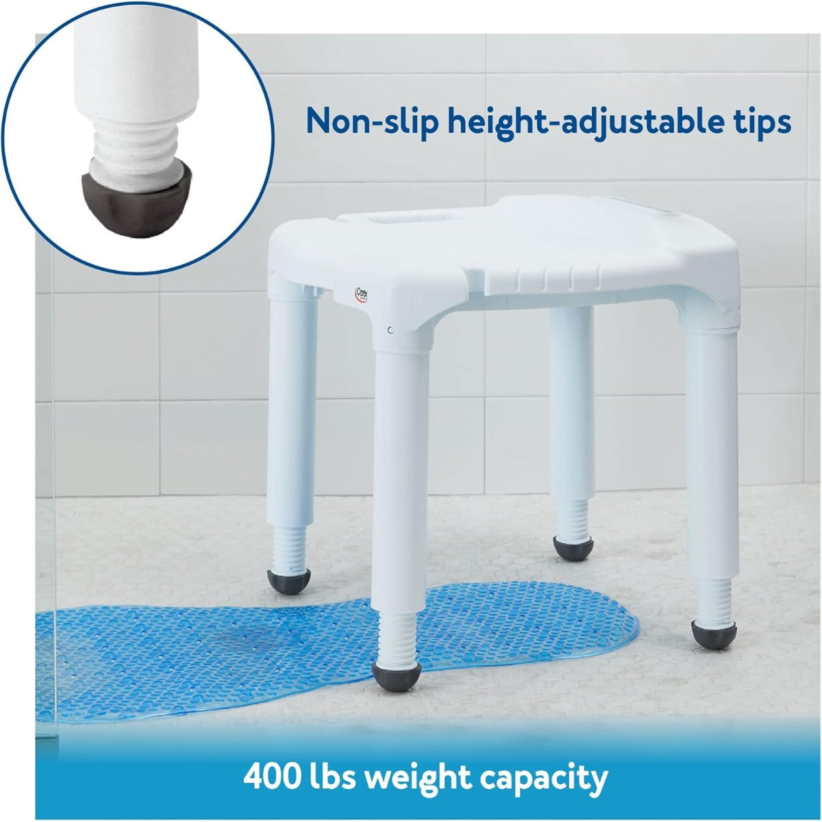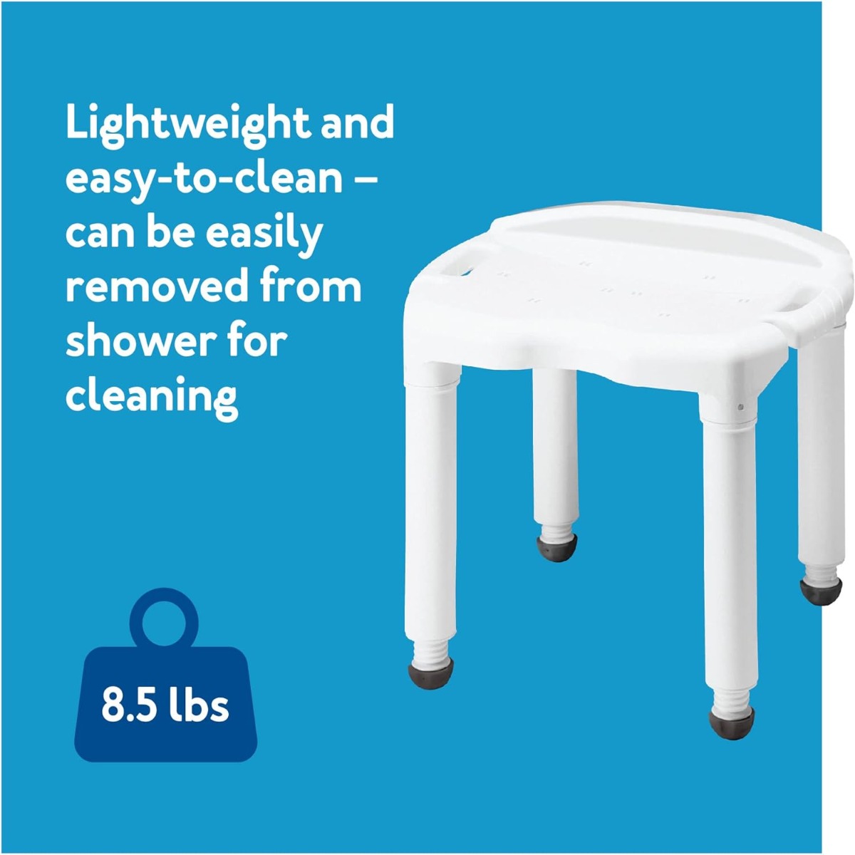 EASY ASSEMBLY. A shower stool that is easy to assemble and requires no tools. Shower chair also features a notch to hold a handheld shower.