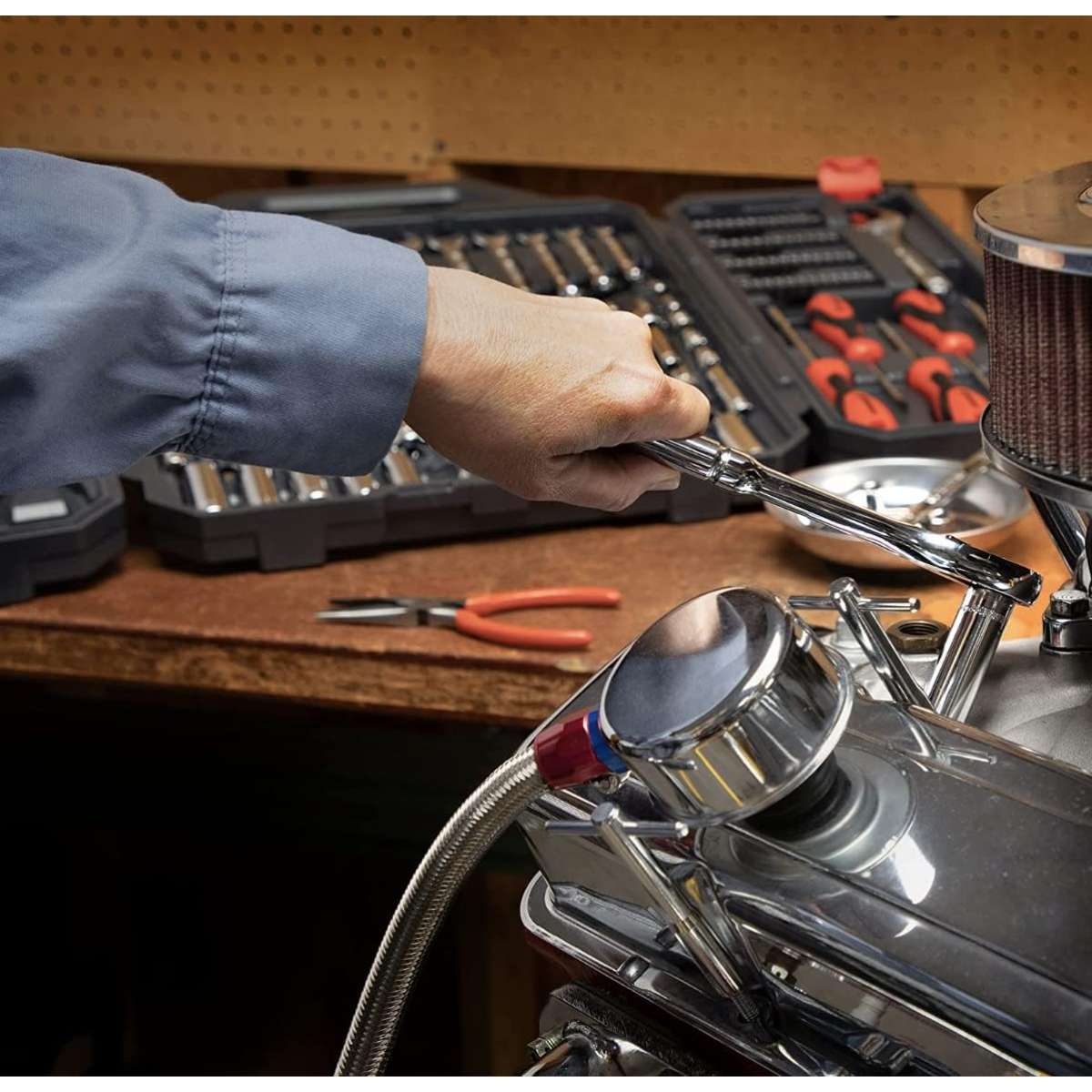 Get incredible access from combination wrenches with narrow heads, adjustable wrenches and pliers, and low profile head quick release ratchets all in this tool set