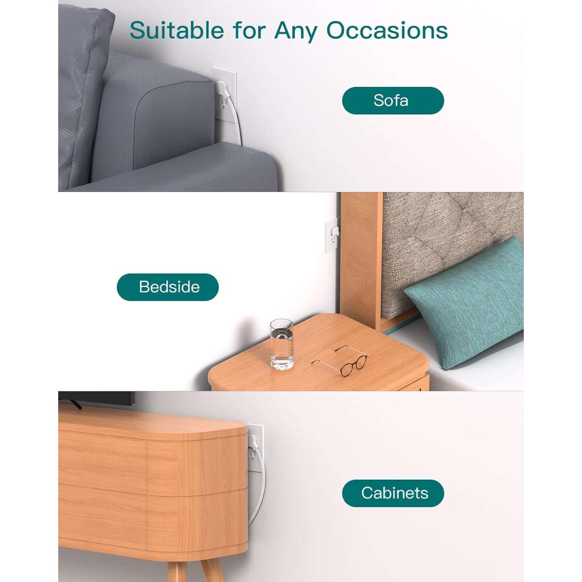 【Right Angle Ultra Flat Plug 】 - With only 0.35 inch ultra thin plug and 45-degree right angle design, which is much slimmer than traditional plugs, which can close to the wall easily, and hide in the back of furniture, bed or refrigerator, no waste for every inch space for your home