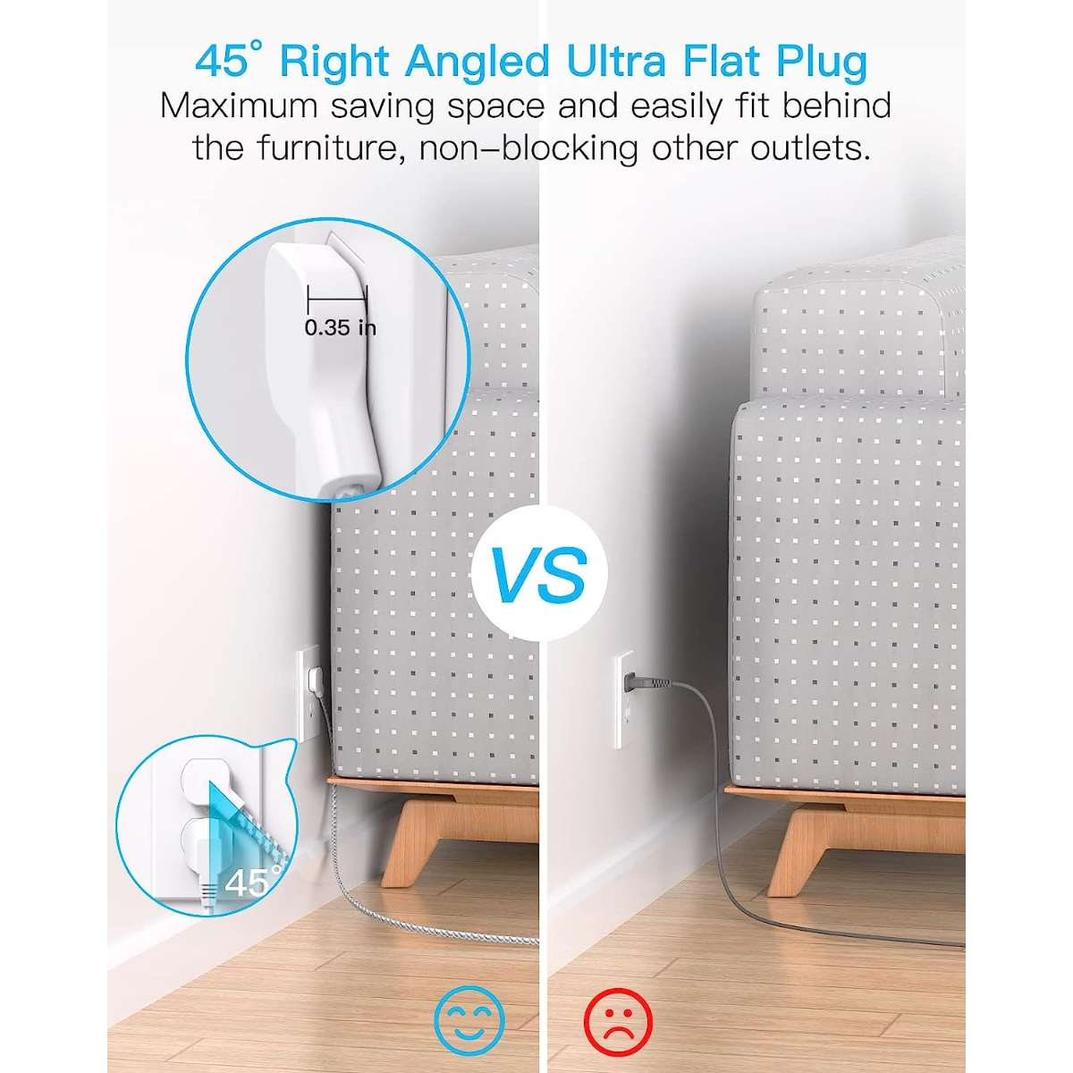 【Right Angle Ultra Flat Plug & 5 Ft Braided Extension Cord】 - With only 0.35 inch ultra thin plug and 45 degree right angle design, which is much slimmer than traditional plugs, can close to the wall easily and hide in the back of furniture, no waste for outlet and space. 3mm thicker extension cord is made of pure copper, which has better current carrying capacity (15A). The braided power cord is not easy to deform, durable and more safety.