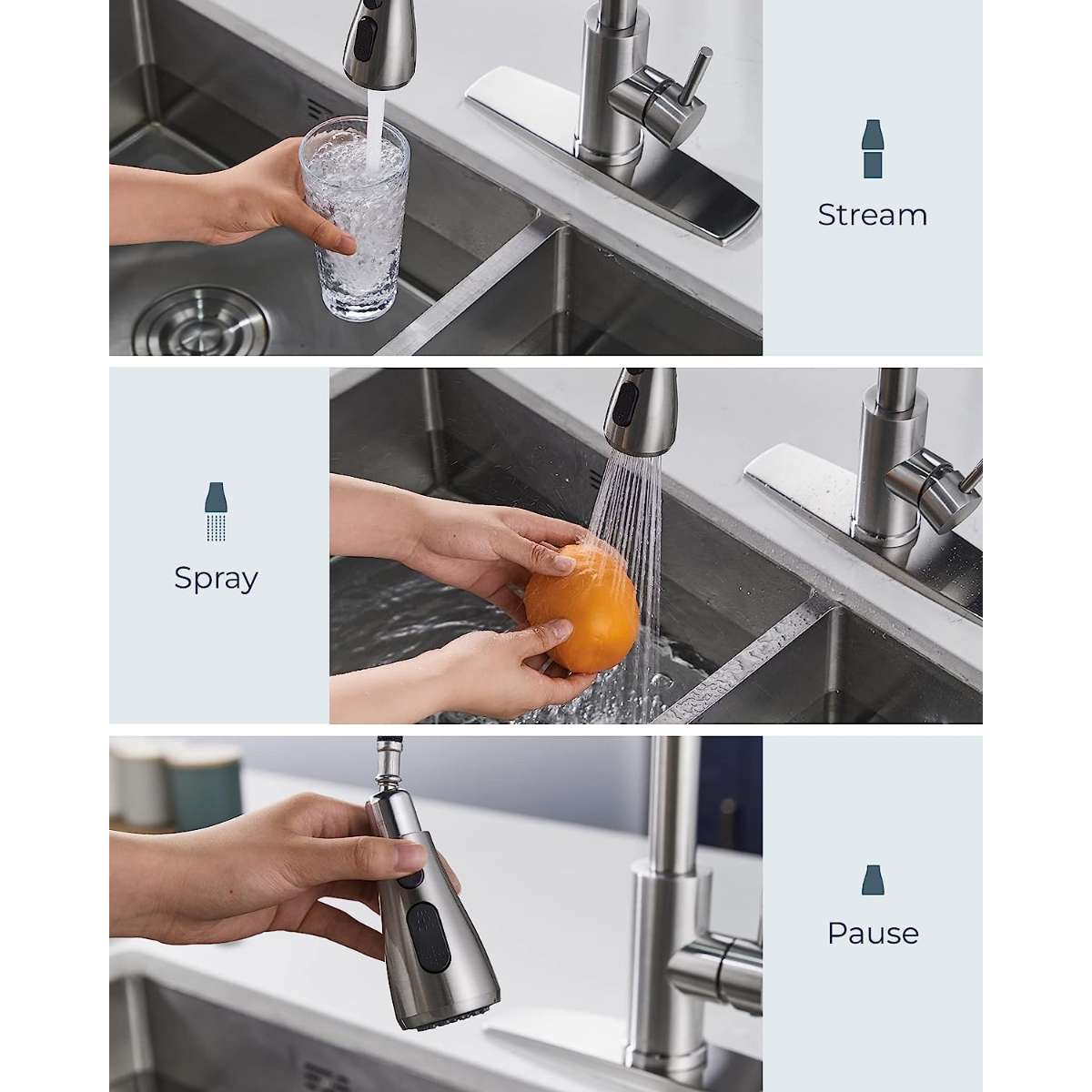 【Address Your Various Needs】FORIOUS kitchen faucet pull-out offers three spray settings (Stream, Spray, Pause) for easy rinsing and water flow control. Use spray mode for cleaning, and switch to stream for filling or washing hands. With its high arc design, 18-inch retractable hose, and 360° rotating sprayer and spout, it covers your sink efficiently. Its trendy handle design ensures effortless control over flow and temperature. Simplify your kitchen tasks stylishly with FORIOUS!