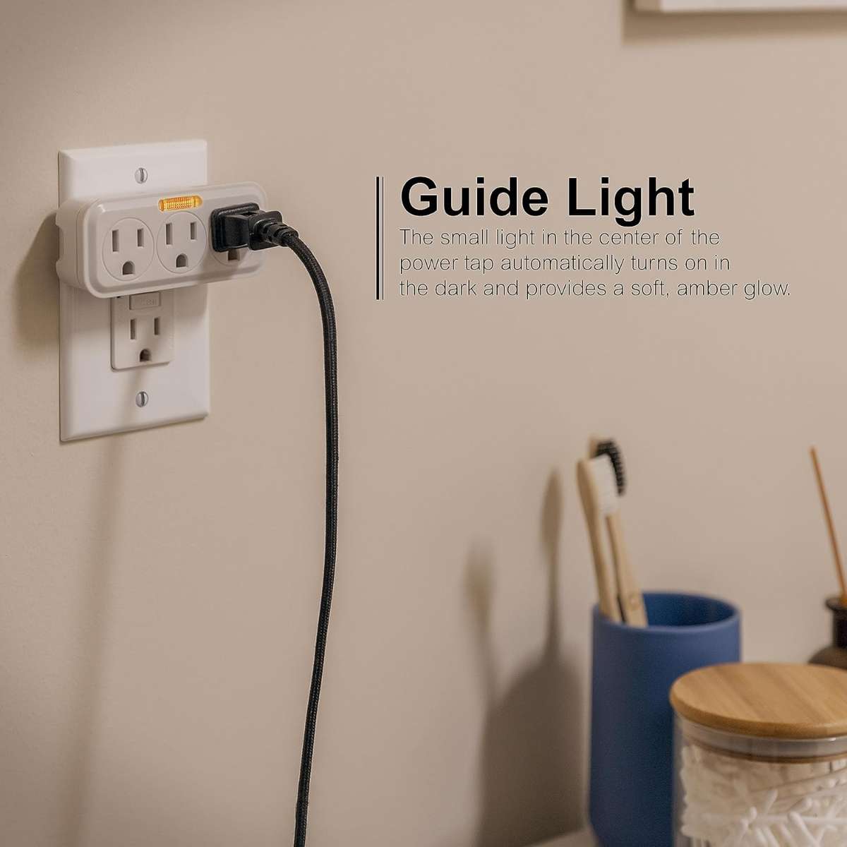 Space Saving – Horizontal design of the GE 3 Outlet Adapter Wall Tap with Guide Light keeps all plugs close to the wall to avoid clutter