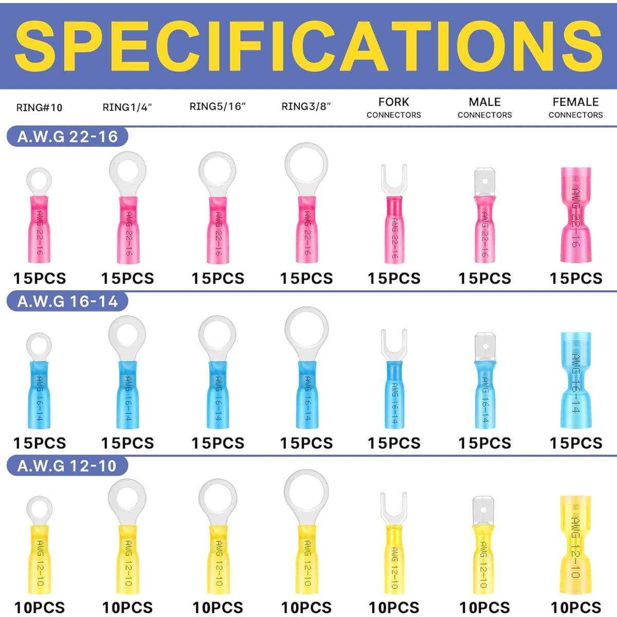 A MUST FOR ANY MARINE WIRING PROJECTS:The package includes 280PCS heat shrink connectors,A crimping tool for heat shrink wire connectors(HS-8327),Wire stripper.Great value for wiring lovers.