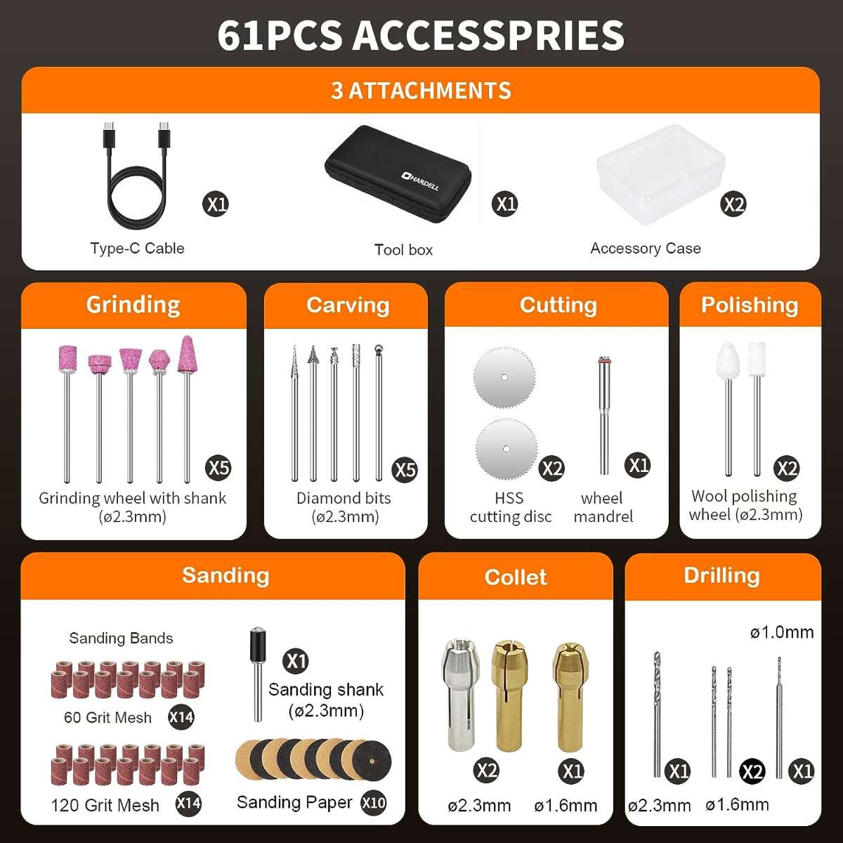 【Versatile Rotary Tool Set】This rotary tool set includes a high-performance and low-noise rotary tool with 61 of the most popular power rotary tool accessories for fine DIY work. Ideal for carving, sanding, grinding, polishing, or cutting, this electric rotary tool is perfect for creating resin crafts. It's like having a whole toolbox in one convenient package. Note: Not suitable for heavy-duty projects