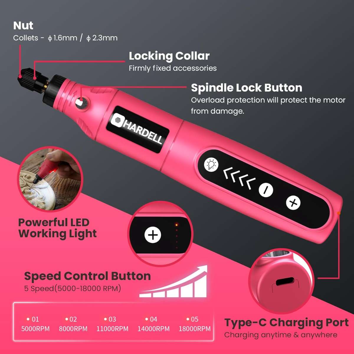 【5-Speed Settings】The cordless rotary tool has 5-speed adjustments (5000/8000/11000/14000/18000RPM) for easier speed control and to meet the power demands of different tasks. This allows for safe and careful sanding in stages, even for beginners who can easily control the speed. With the micro rotary tool, your creations are always handy