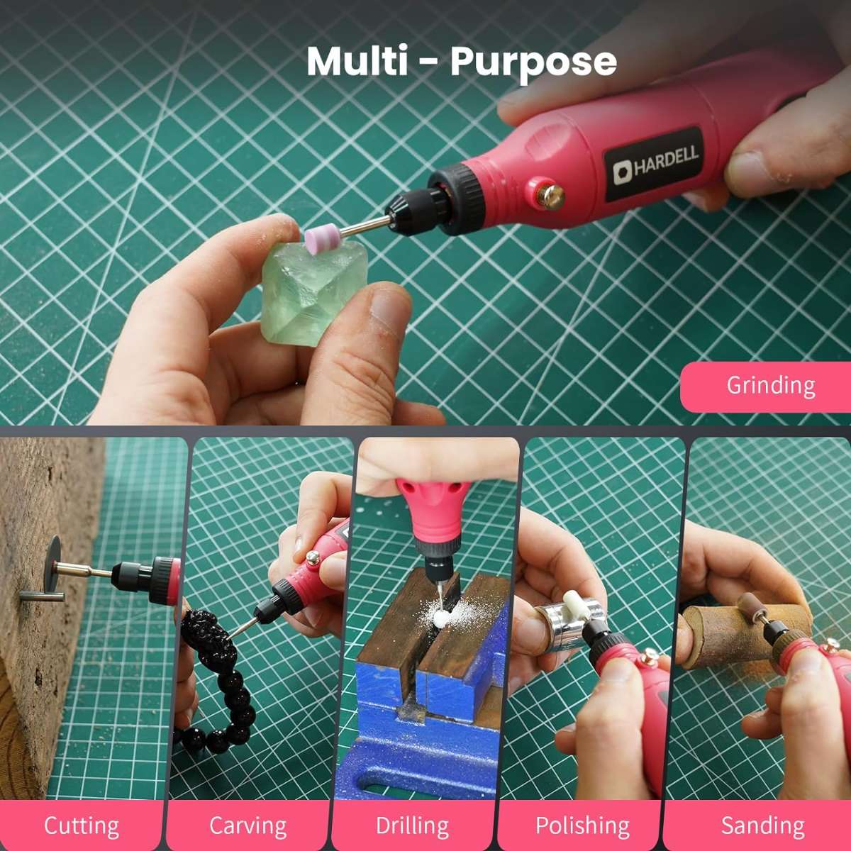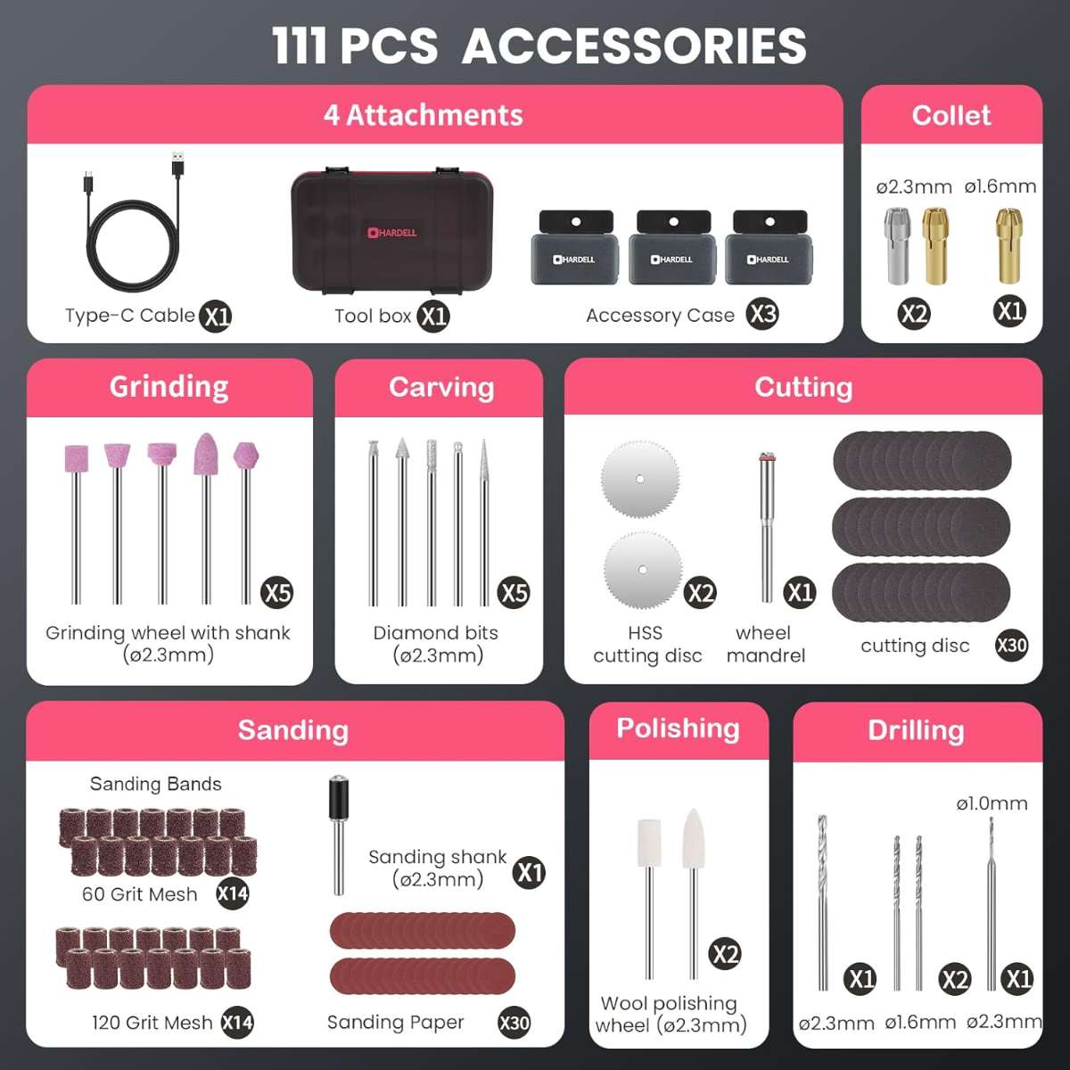 【Versatile Rotary Tool Set】This rotary tool set includes a high-performance and low-noise rotary tool with 111pcs of the most popular power rotary tool accessories for fine DIY work. Ideal for carving, sanding, grinding, polishing, or cutting, this electric rotary tool is perfect for creating resin crafts. It's like having a whole toolbox in one convenient package. Note: Not suitable for heavy-duty projects