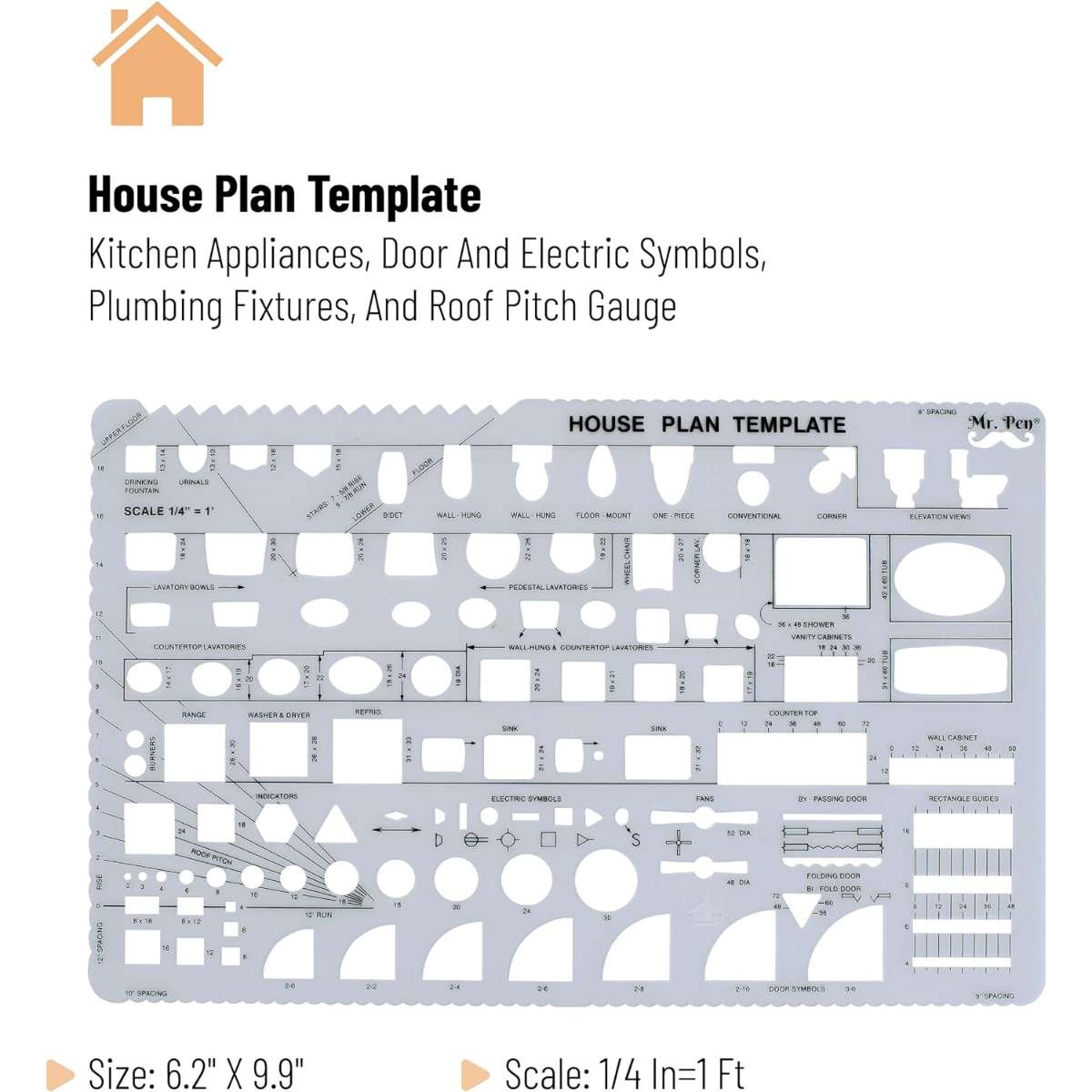 House Plan Template: Kitchen Appliances, Door And Electric Symbols, Plumbing Fixtures, And Roof Pitch Gauge