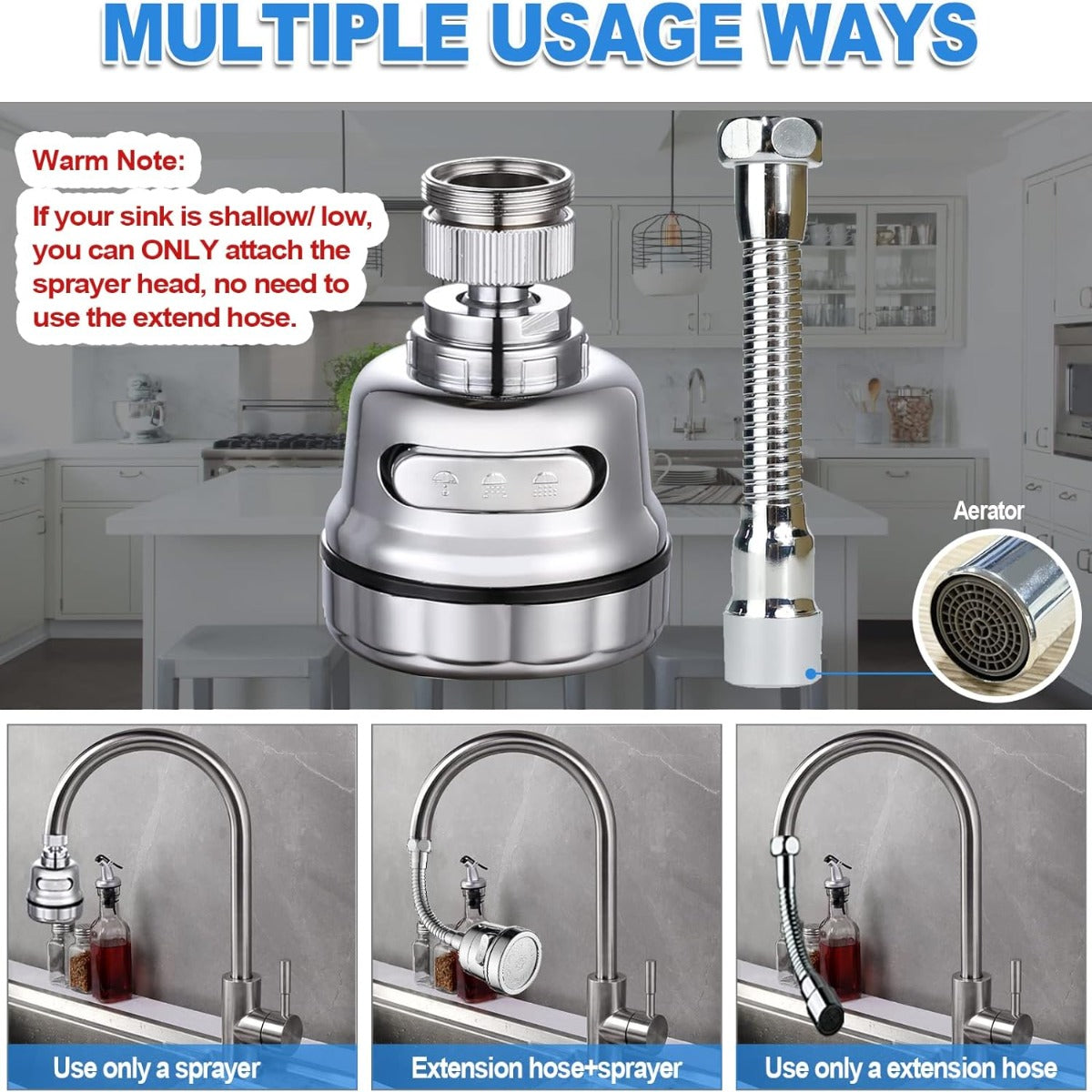 【Ergonomic & Humanized Design】:The kitchen sink faucet aerator swivels 360°, freely rotatable at any angle you want for convenience. With a stainless steel extender hose, this movable kitchen tap head allows you flush more rangely each sink corner or cleaning the whole sink more widely. If your sink is shallow, you can use the faucet sprayer head attachment only without attaching the extension hose.