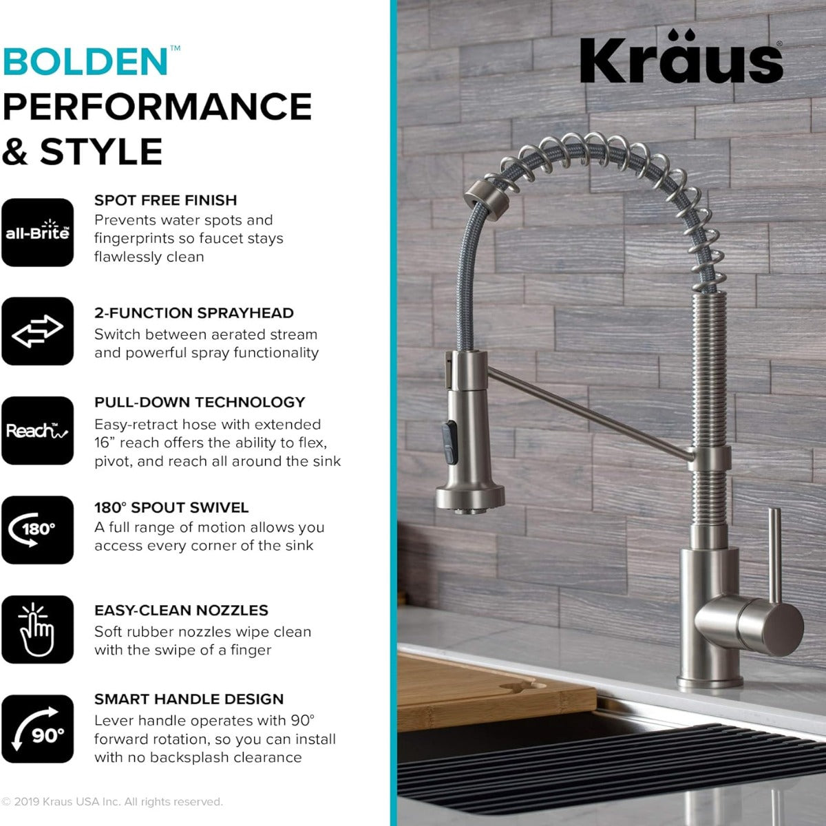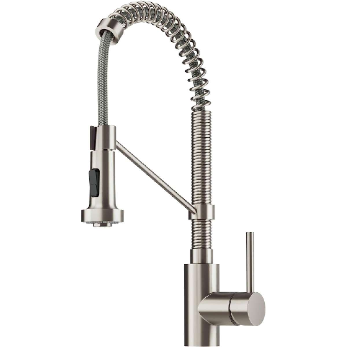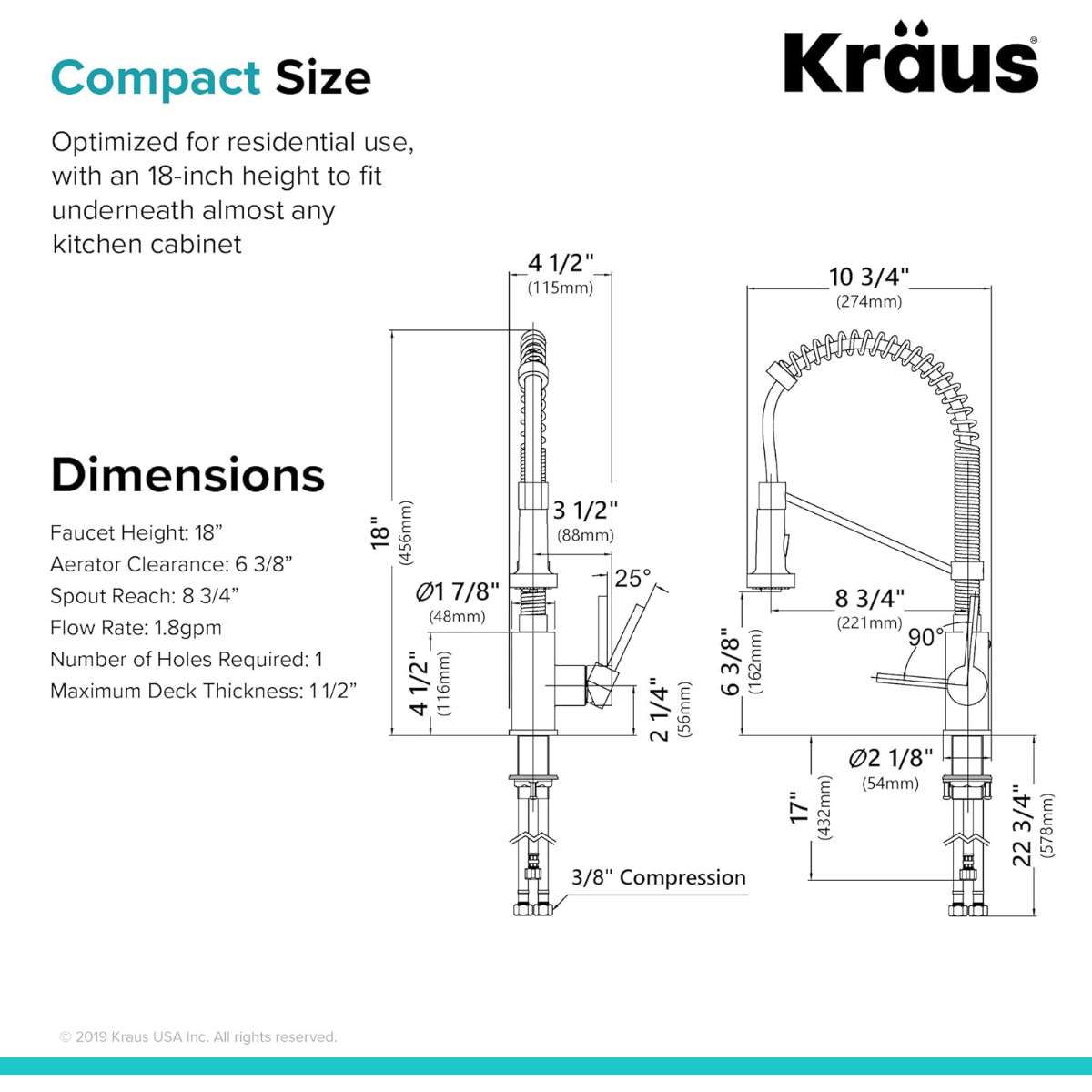 COMMERCIAL-STYLE FAUCET is both flexible and functional, with a heavy-duty open coil spring spout for an industrial look – PERFECT FIT: Optimized for home use, compact 18-inch height fits beneath almost any kitchen cabinet – PULL-DOWN spray head offers an extended range of motion all around the sink