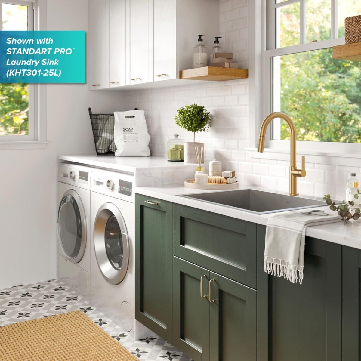 UNIVERSAL DESIGN: The elegant and ergonomic Oletto faucet creates an instant focal point in any kitchen or laundry room – FLAWLESS CORROSION-RESISTANT FINISH will not fade or tarnish over time – Available in SPOT FREE all-Brite Stainless Steel or Antique Champagne Bronze to prevent water spots and fingerprints – FAUCET HEIGHT: 16 5/8 in. – SPOUT REACH: 8 7/8 in. – Swivels 360 degrees for a full range of motion – Flow Rate 1.8 gpm