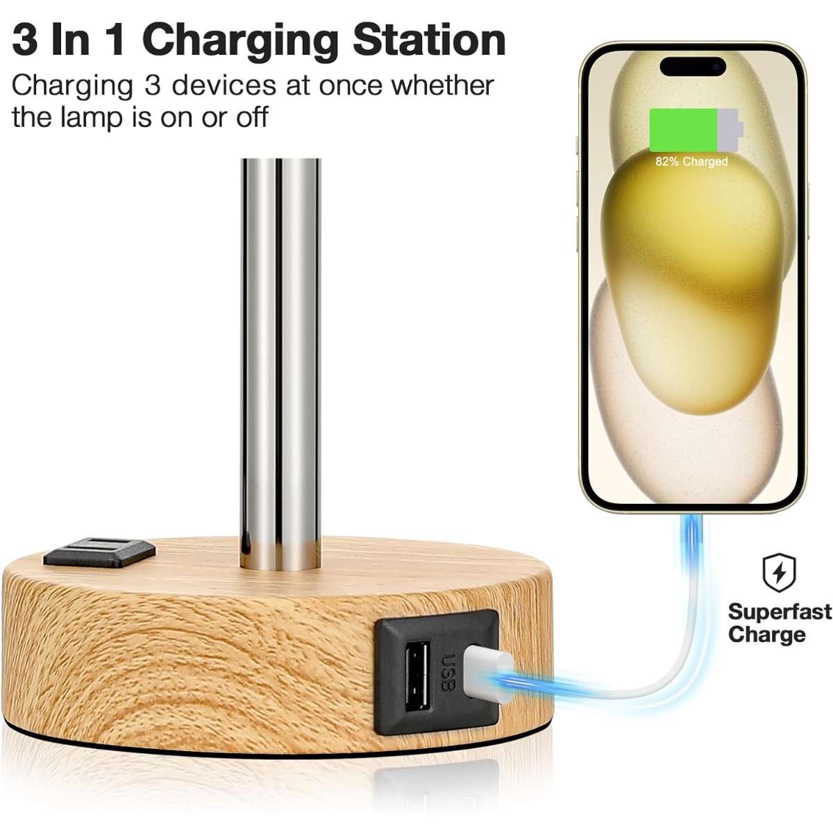 USB & USB-C Charging Ports and Outlet - Power 3 devices at once bedside lamp! With a usb-c port (5V/2.1A) and a usb-a port (5V/2.1A) and an outlet (120v) on the small nightstand lamp for fast charging, getting your phones, pad, laptops, humidifier, headsets, speaker, earbuds and other electronics fully charged all from a single small table lamp no matter if the bed side table lamp is on or off.