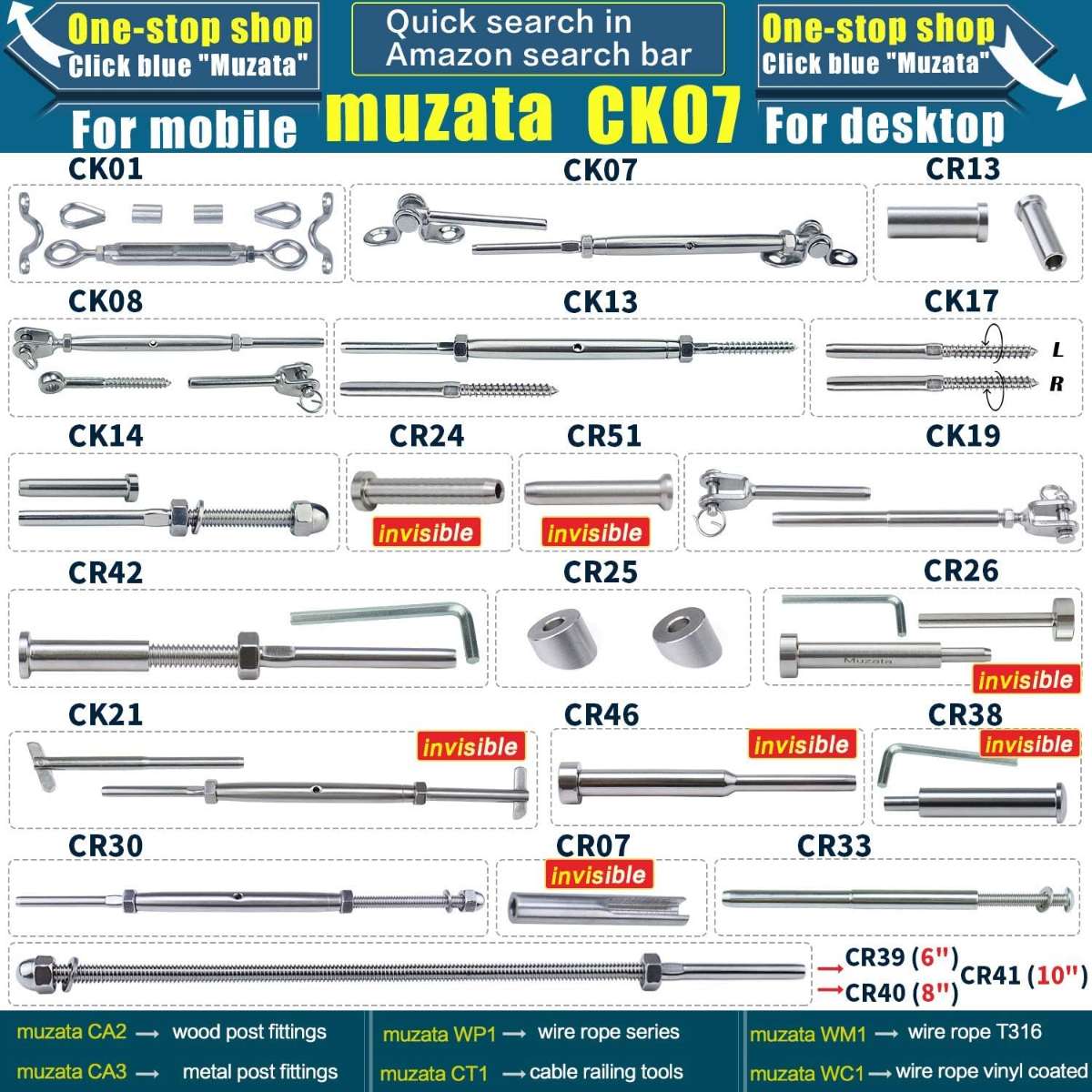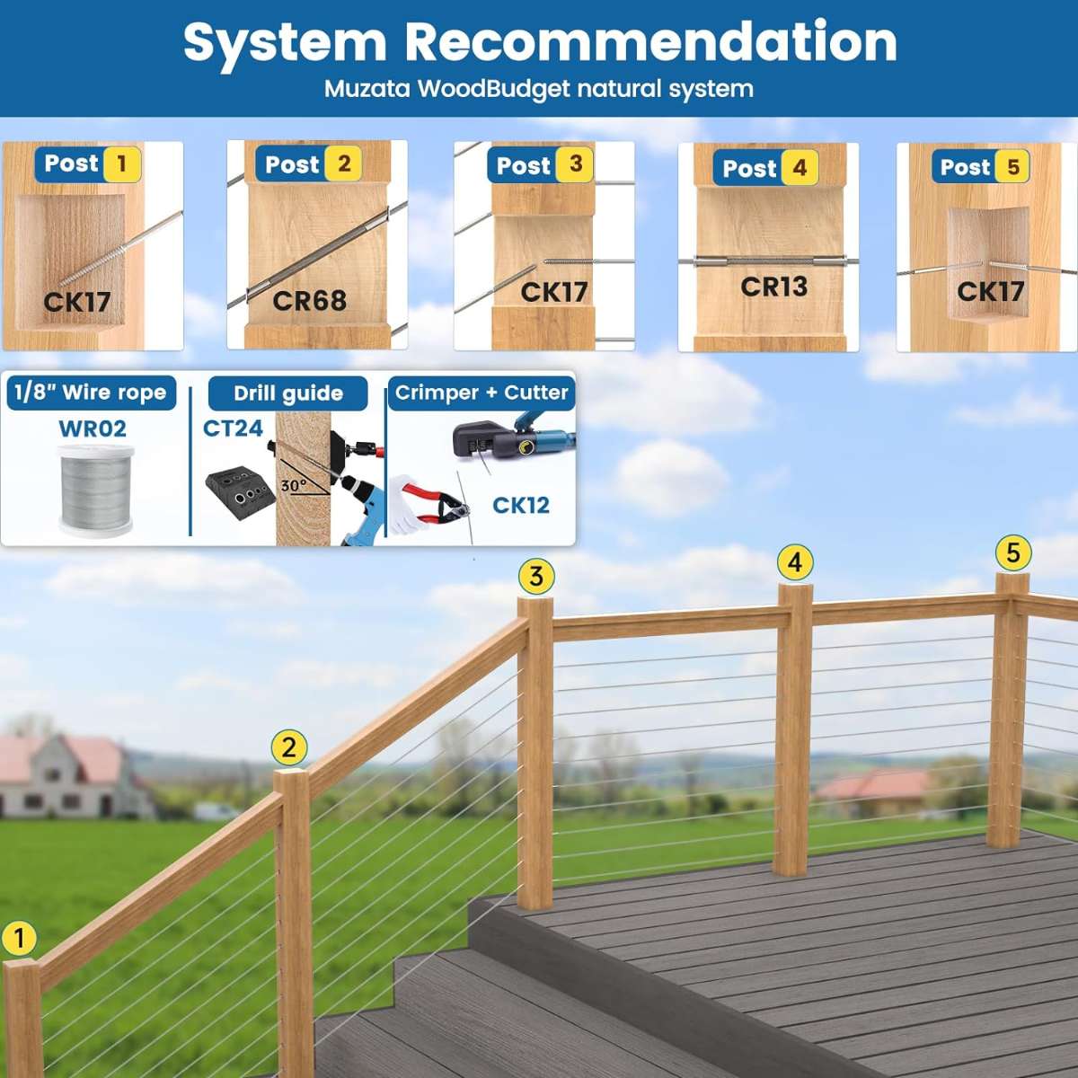 Advice for constructing a system - To help you build MetalEasy black cable railing system more efficiently, we recommend the following product combinations from Muzata, including cable railing kits CR23 CR07, wire rope WR22, protector sleeve CR79 CR90, adhesive washer CR91, angled washer CR25, cable cutter and hydraulic crimper CK12, posts PS01-BA4S PS02-BH4S B34S, handrails HT10-BP4, handrail connectors HA01 HA02 HA23