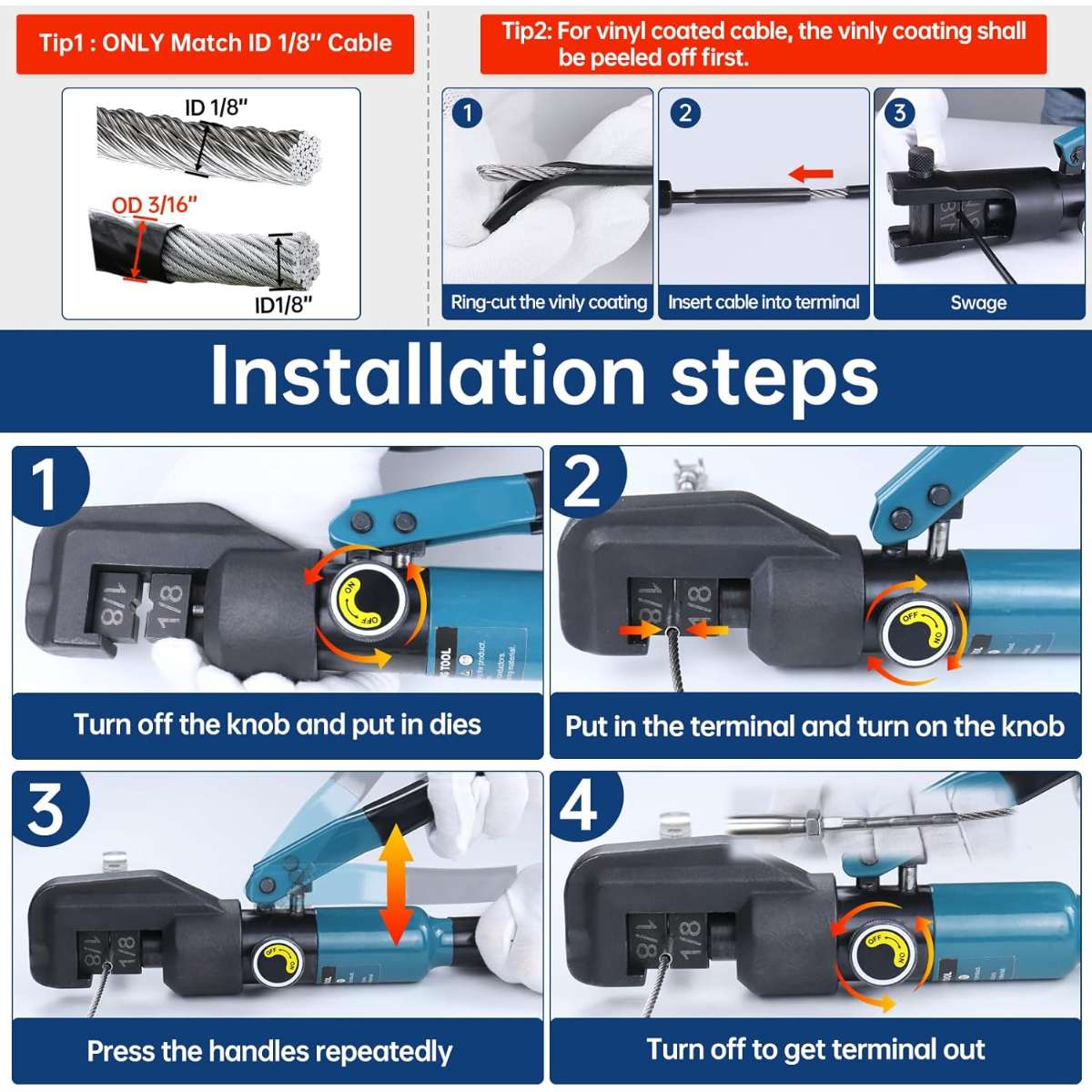 Wide Applications -- This Muzata crimper CR09 fits 1/8" cable railing kits. It also matches regular crimping dies to crimp aluminum ferrules or copper products. We Have Upgraded This Crimper to Resolve the Problems Like Broken Head or Leaking Oil after Repeated Crimping. If You Encounter Situations Like This, Please Reach Us. NOTICE: However, if you are getting SWAGELESS cable railing kitfittings, there would be no need to use a Hydraulic Hand Crimper