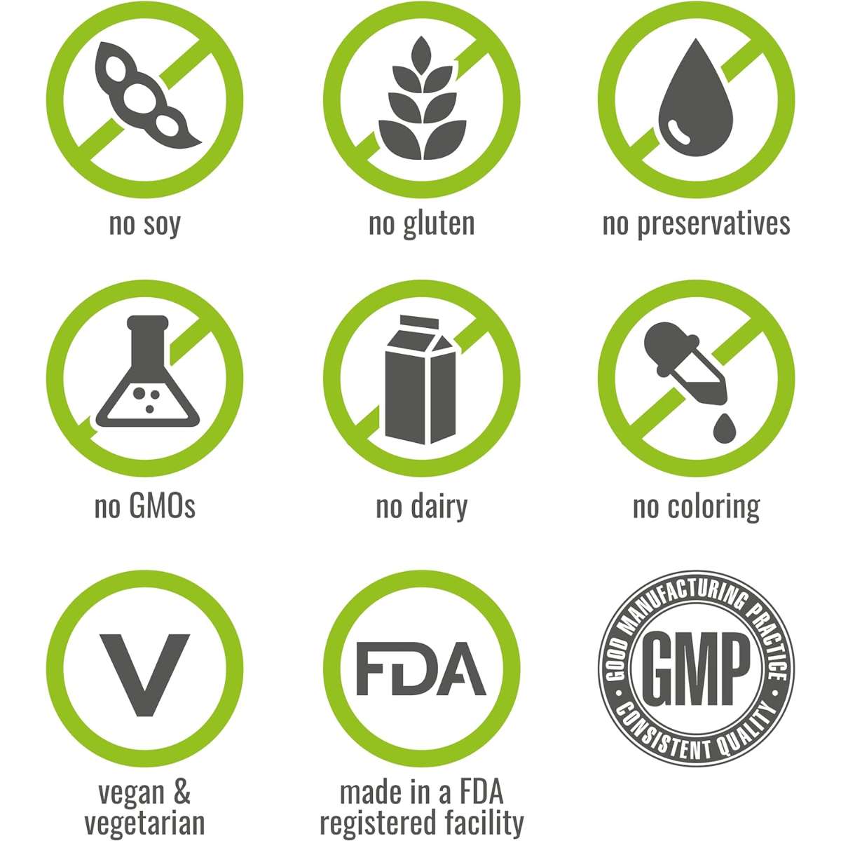 Clean Label: No preservatives, gelatin, coloring or flavoring. Proudly made at a GMP compliant facility. Vegan, Non-GMO, and Soy Free and Gluten Free.
