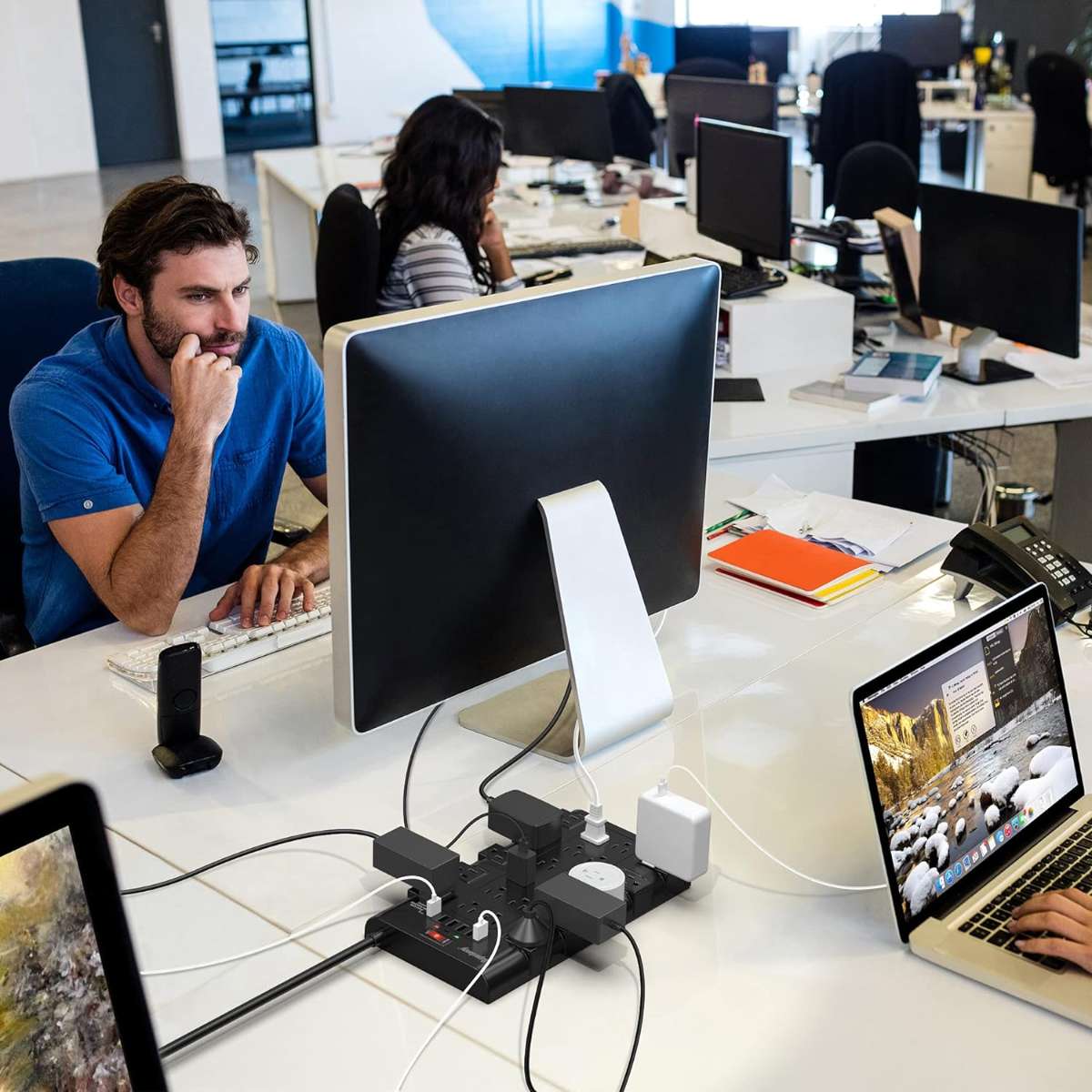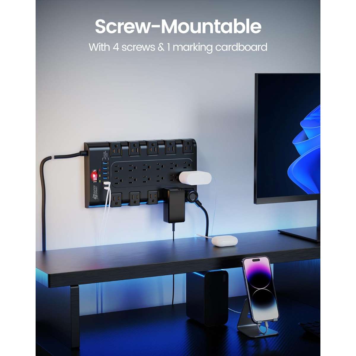 【28-in-1 Versatile Power Strip】 FCC, RoHS safety certified, with the extension cord and flat plug certified by UL. Superdanny power strip surge protector has 22 grounded 3-prong outlets and 6 USB ports, providing power for all devices that you need to plug in at one location. Perfect for gaming or media set up, surround sound system, TV, phone, tablet, PC, laptop, gaming computers, lamps, and other devices simultaneously.