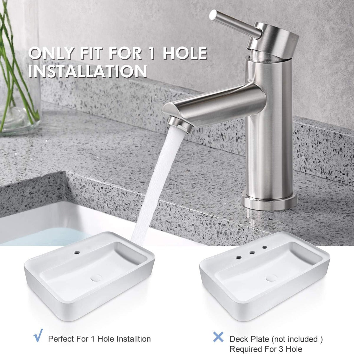 【One-Hole Bathroom Faucet】Designed to fit 1 hole configurations(Deck plate Not included).