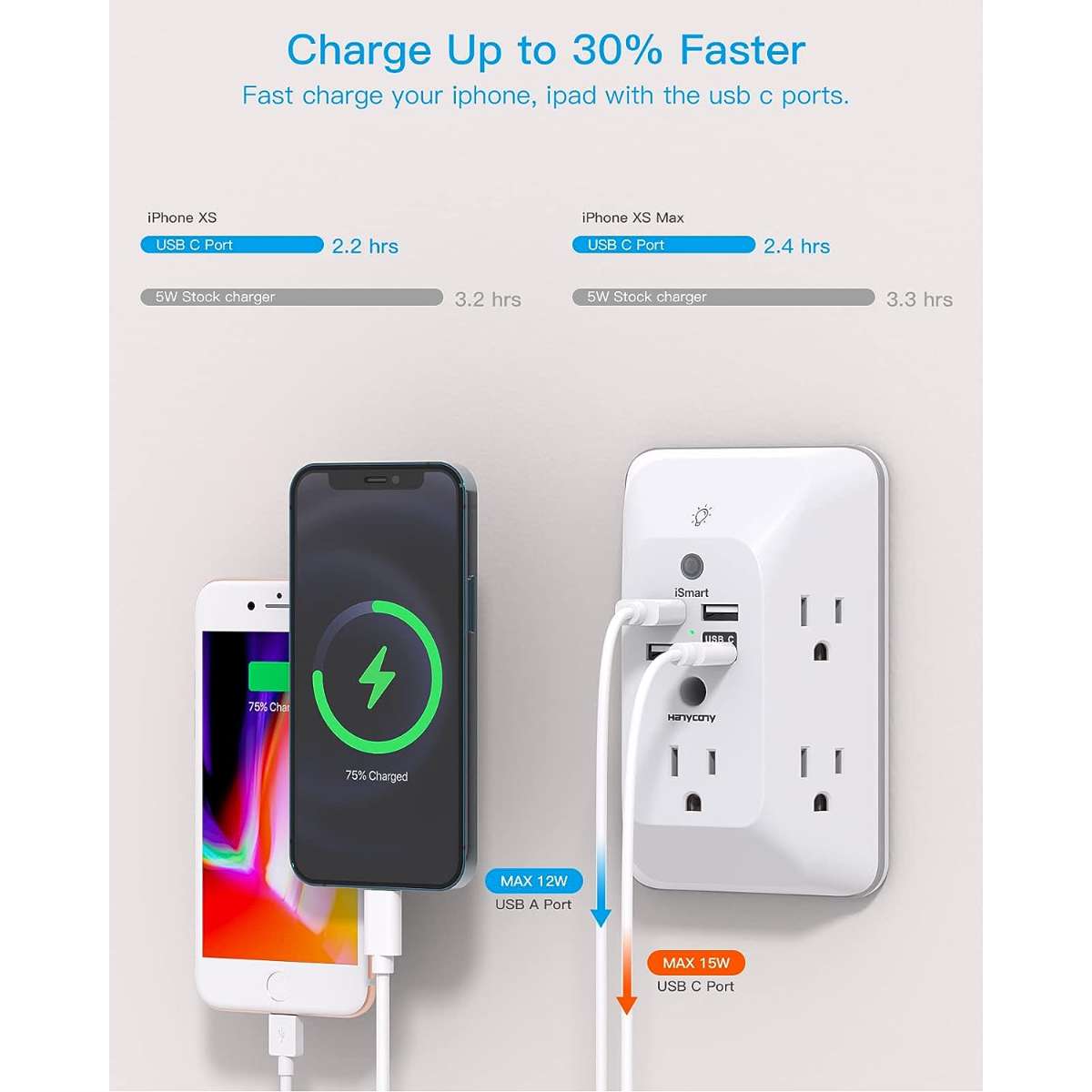 【USB C Fast Charge & Wide Space】- 1.7 inches large space beetween 5 adapter outlets on the side which can easily fit for big head chargers. The 4 usb ports total 3.1A, and the USB C ports built in smart technolohy, can detect and charge your devices quickly, up to max 5V/3A,compatible with most type c devices.(NOTE: The UCB-C port doesn't support any other devices which need 14~22V charging voltage)