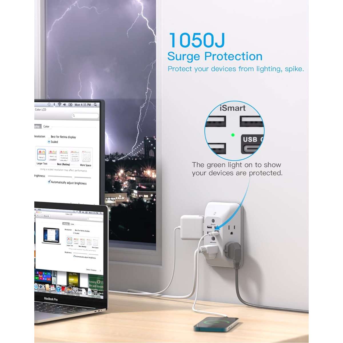 【Surge Protector Outlet】- 3 complementary Surge Protection Circuits, TVS(transient voltage suppressor) MOV(metal oxide varistor) GDT(gas discharge tube), with response speed less than 1Ns, and minimum energy-absorbing capacity of 1050 Joules, much more quickly and reliably than the traditional MOV surge protector circuit. ("SURGE PROTECTED" indicator light on to show your devices are protected)