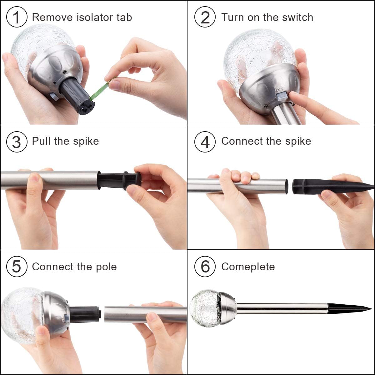 【Tips】1. The ground spike is placed inside the light pole and you can pull the spike out of the pole. 2. If the ground is too hard, you need to use tools to loosen the soil first, and then insert the stick of the solar lights into the ground.