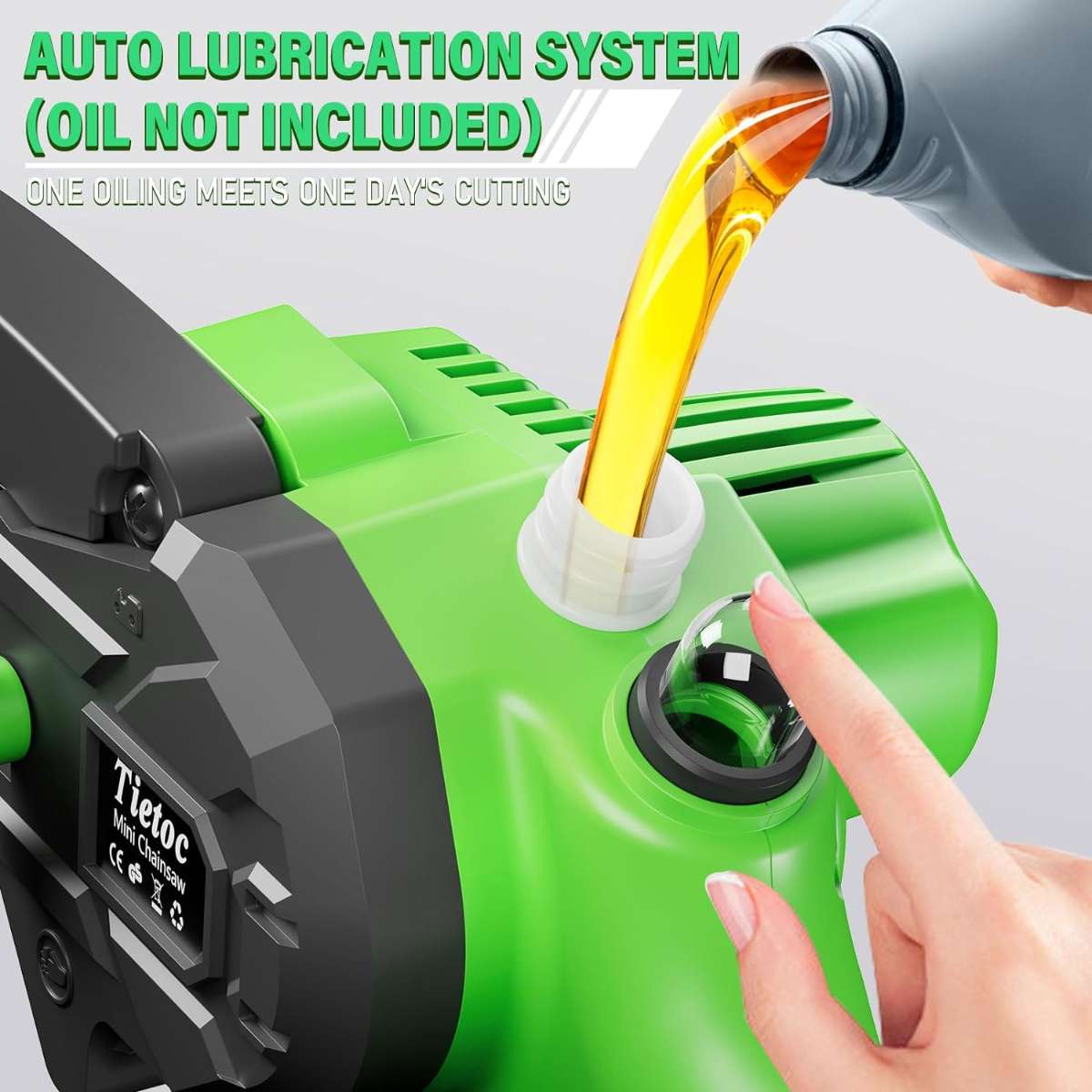 AUTO OILER-SYSTEM: This mini chainsaw cordless is equipped with auto chain lubrication system. Just pour oil (general motor oil is fine) into the tank, then you can freely lubricate the chain by pressing, reduce wear and tear for smoother cutting, more cuts and less energy use. One oil fill can be used for a whole day, no more carrying around a heavy bottle of lubricating oil!