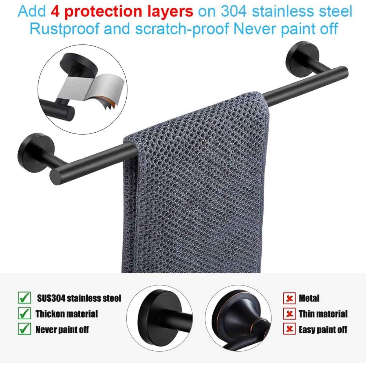 【PERFECT 5-PIECE COMBINATION】 -- This perfect towel rack set combination will not make any products idle. The bathroom hardware set includes: 16‘’ hand towel bar, toilet paper holder, 3 robe multifunctional hooks. They suitable for different style decoration.
