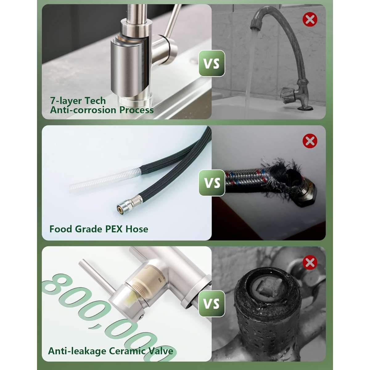 Durable kitchen sink faucet: Your high-quality kitchen faucet stainless steel, which is treated with 7-layer finish processing, is sturdy and free from rust. The sus304 stainless steel kitchen faucet coming with high quality sprayer head, is heavy duty and durable. The high quality ensures its longevity for more than 10 years.