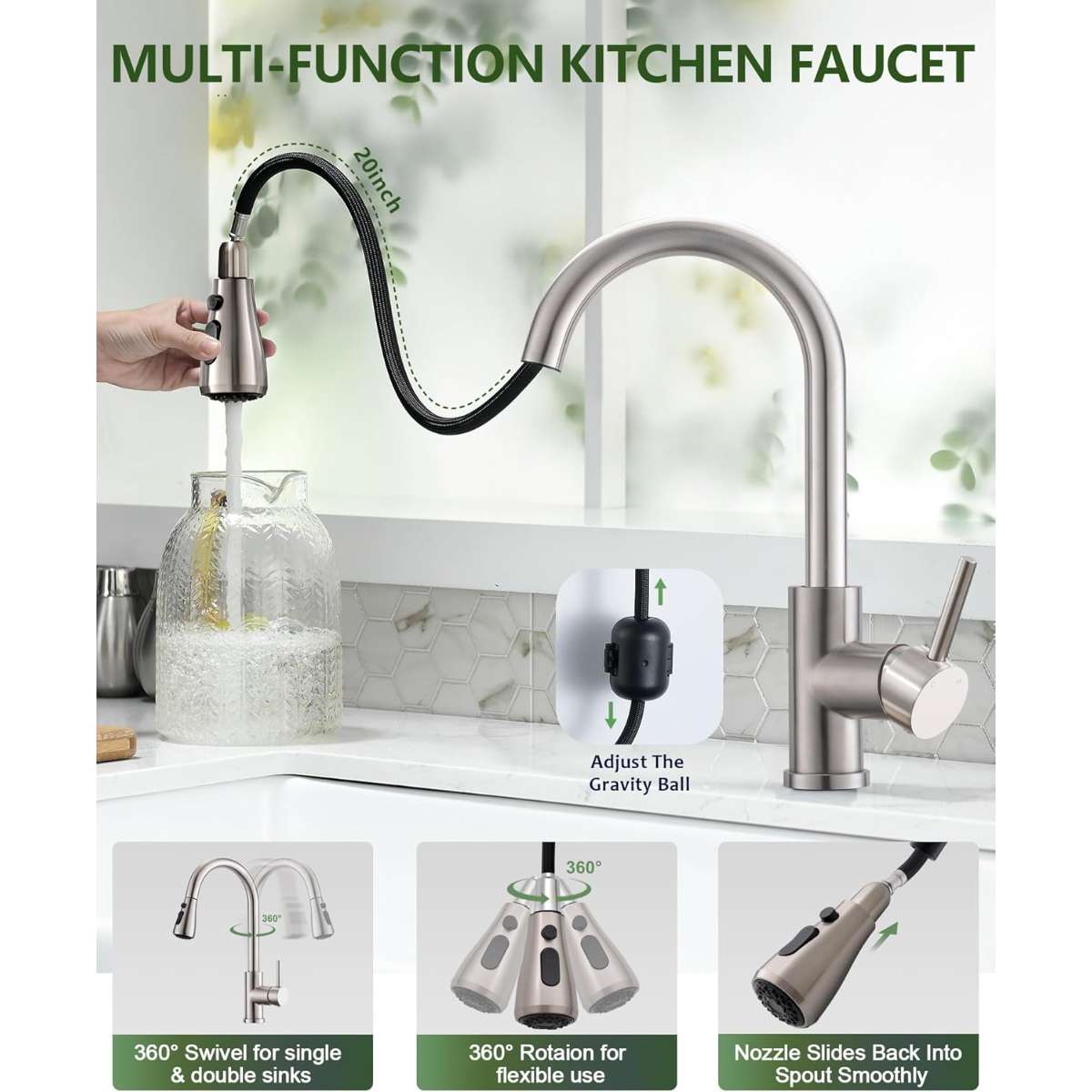 Three Function water: This kitchen faucets with pull down sprayer provides a choice of a non-splash aerated stream, a powerful spray or pause, facilitates various kitchen tasks, making you free from all kinds of messy kitchen issue. Enjoy more time with your family