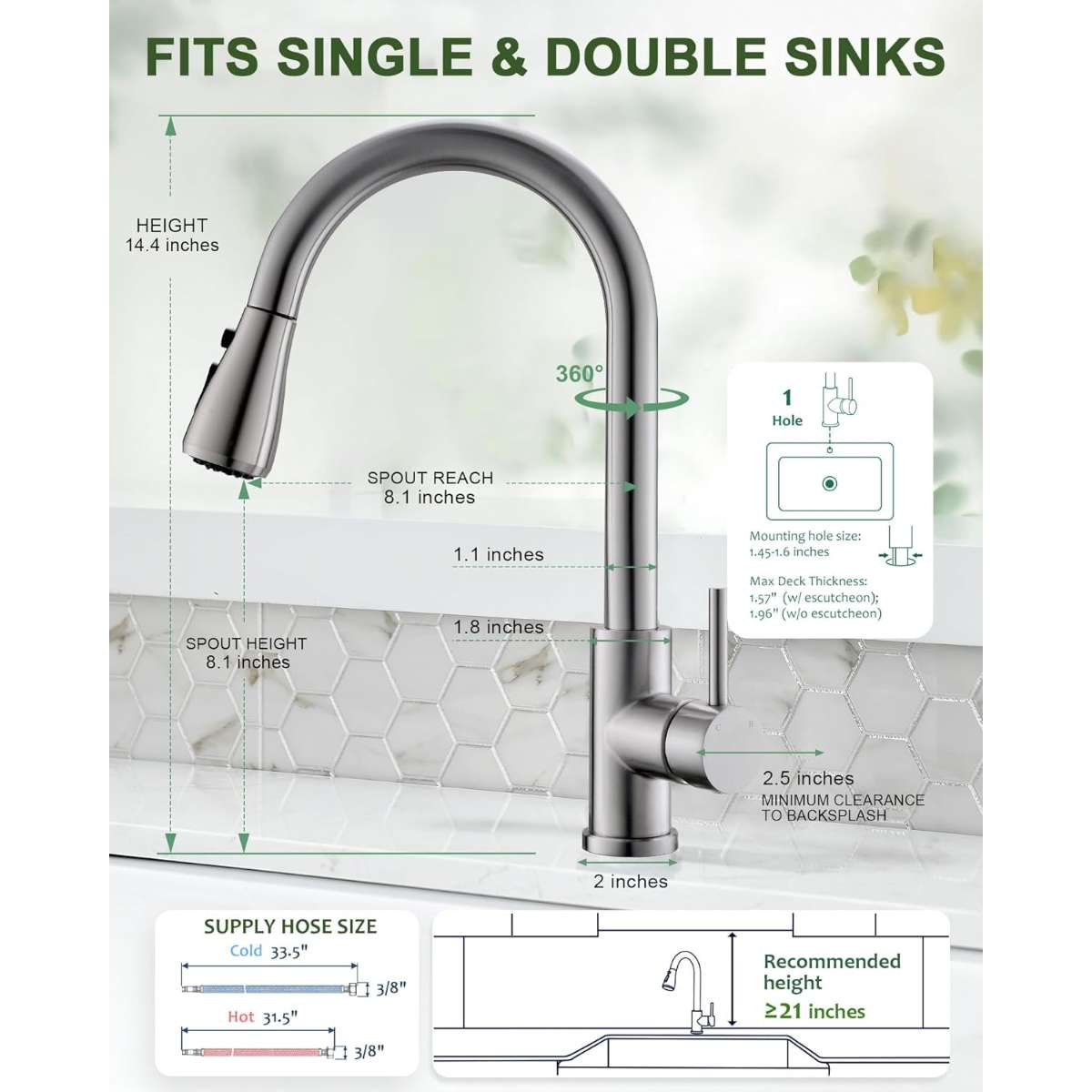 A perfect fit: Your pull down kitchen faucet with sprayer fits for almost all kitchen sinks, such as a bar sink faucet, camper kitchen faucet or laundry sink faucet. A perfect way to upgrade your kitchen!