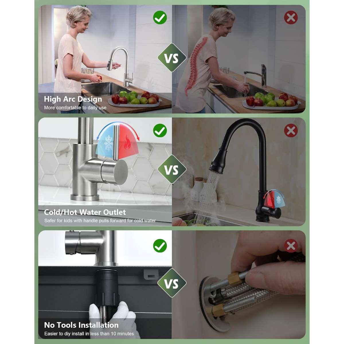 Safe sink faucet: This kitchen faucet with pull down sprayer is designed specially that cold water comes out when pulling forward, is more safer comparing to most kitchen faucet in the market. CARE MUCH MORE FOR YOUR SAFETY, especially for the old and the young!