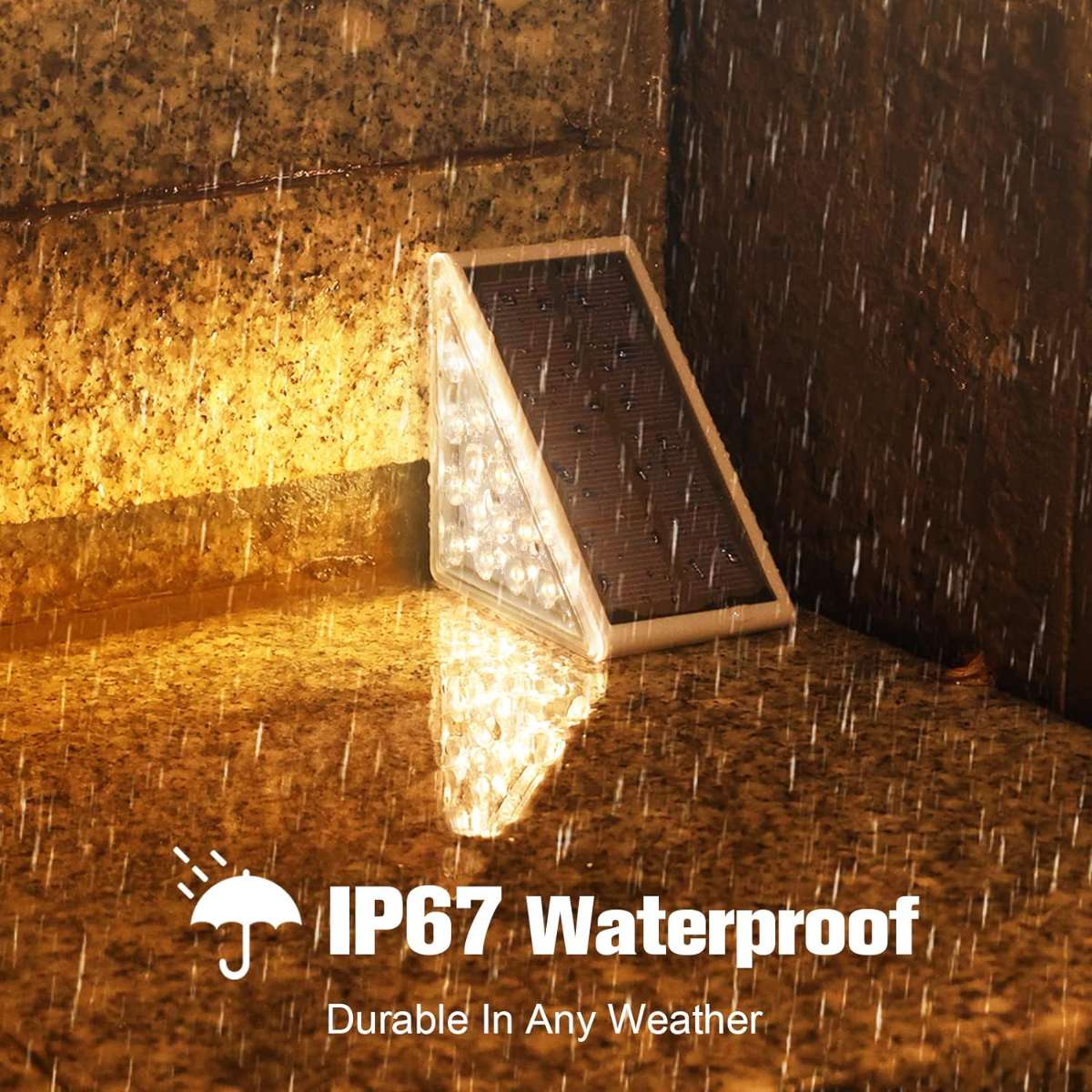【Easy Installation】No wiring required, solar lights for steps are perfectly decored on garden stairs, patio, yard, deck, porch step and sidewalk,etc. The triangle solar outdoor lights go in the corners so they are not in the way. No worry about stepping and tripping. 2 installation ways: 1)Directly attached to the stairs by 3-M sticky tape. 2)Fix the outdoor accessories on the stair by screws and bolts. (Tips: Solar stair lights need to be installed in a sunny spot.)