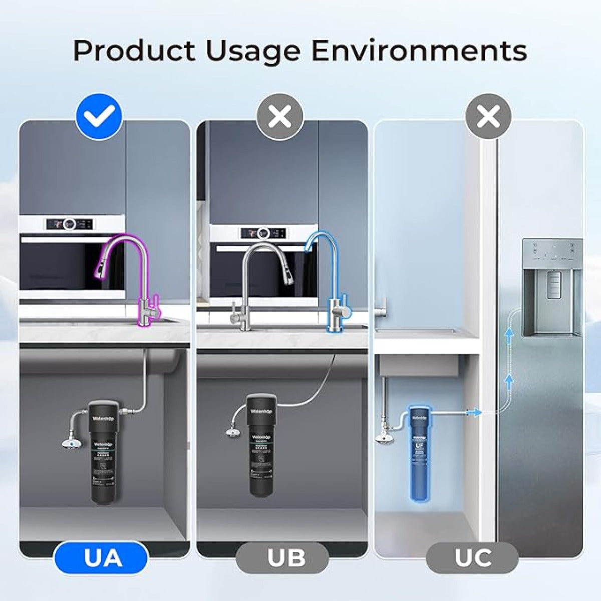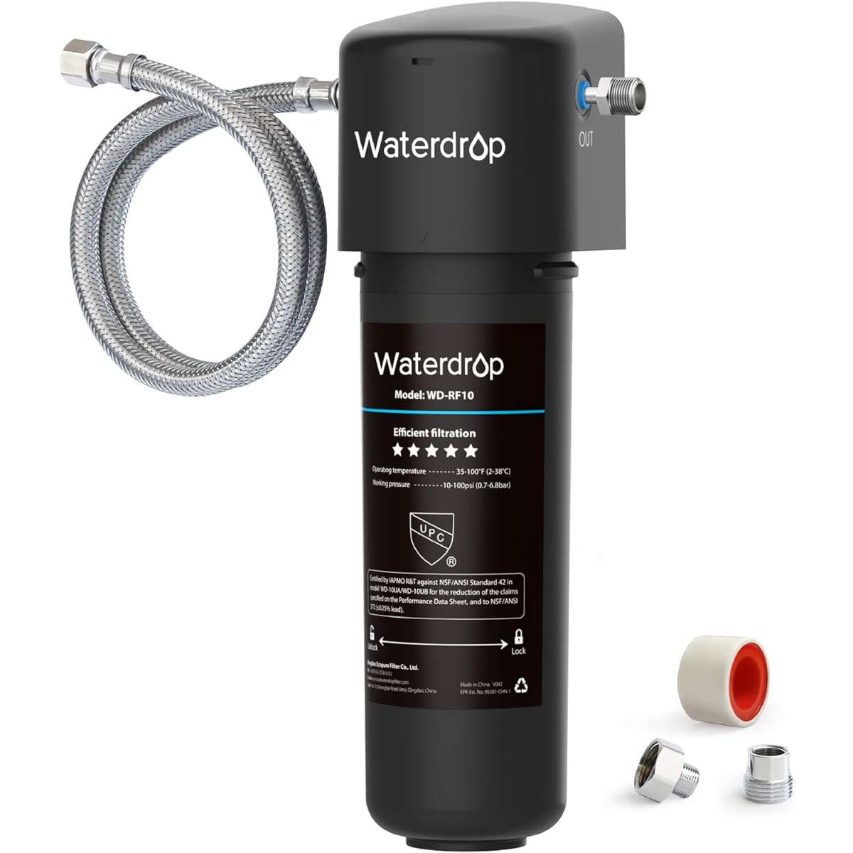 [Upgraded Connection Mode] This Waterdrop under sink filter with inlet and outlet pipes changes its connection mode by using a new converter, which can be directly connected with your own faucet hose with no new hoses required. With a 1/4" quick connection-3/8"converter, installation is faster and easier. Plus, the included 3/8" to 1/2" converter ensures compatibility with any household faucet. Please note this under sink water filtration system is only used for being connected with COLD WATER supply!
