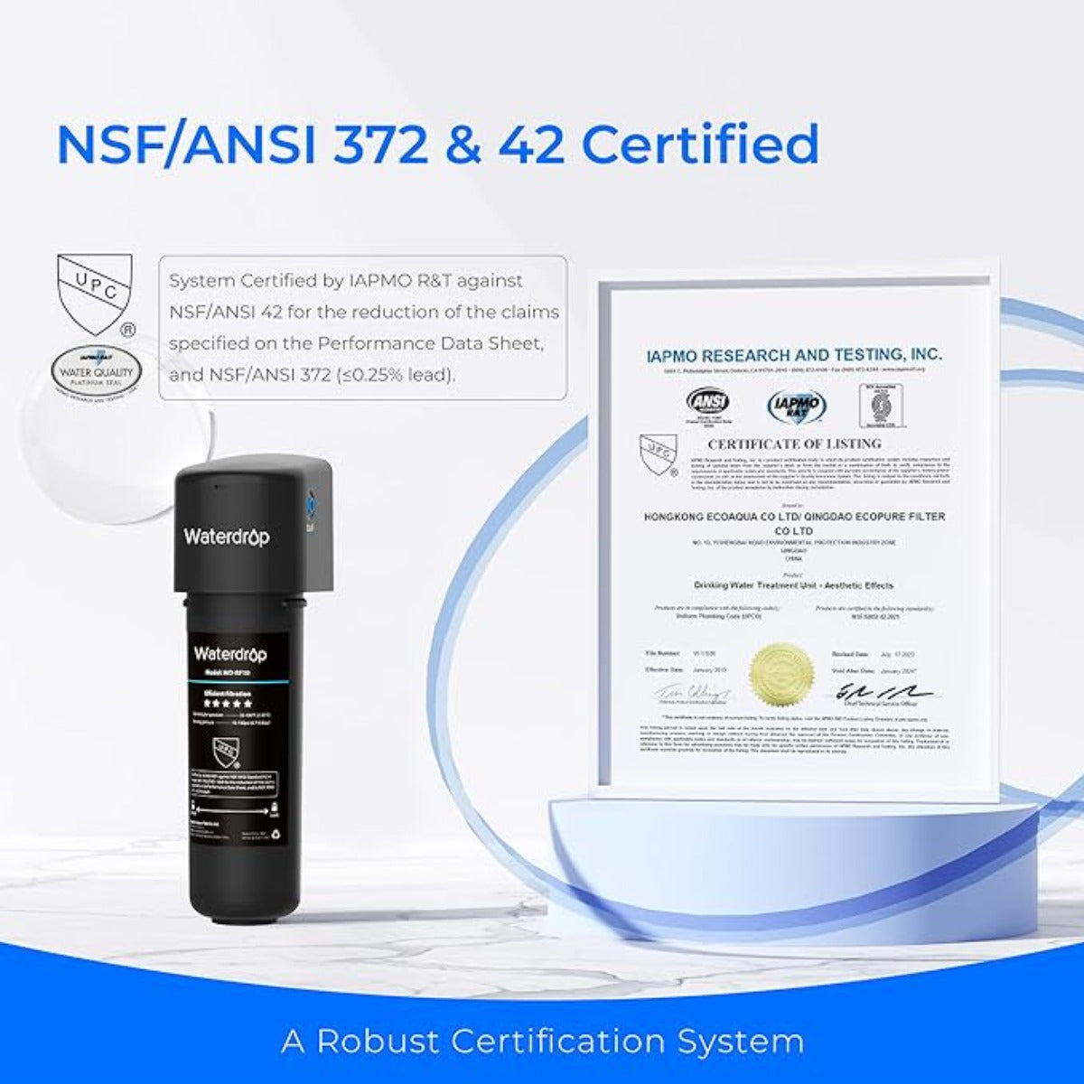 [NSF/ANSI 42 & 372 Certified] This under sink water filter has been certified by IAPMO R&T against NSF/ANSI 42 & 372 and can effectively reduce chlorine, taste and odor, PFAS, PFOA/PFOS, chlorobenzenzene, lead, VOC, turbidity and more, tested by a third-party laboratory, improving your drinking water quality.