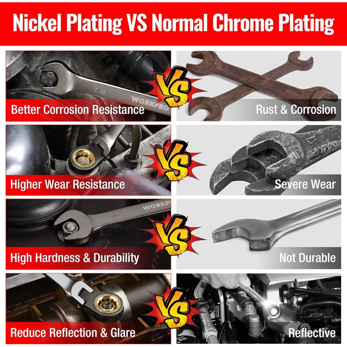 Our wrenches are made from high quality heat-treated Cr-V alloy and nickel plated for durability. Flexible rotation is convenient for small space operation and effortless operation.