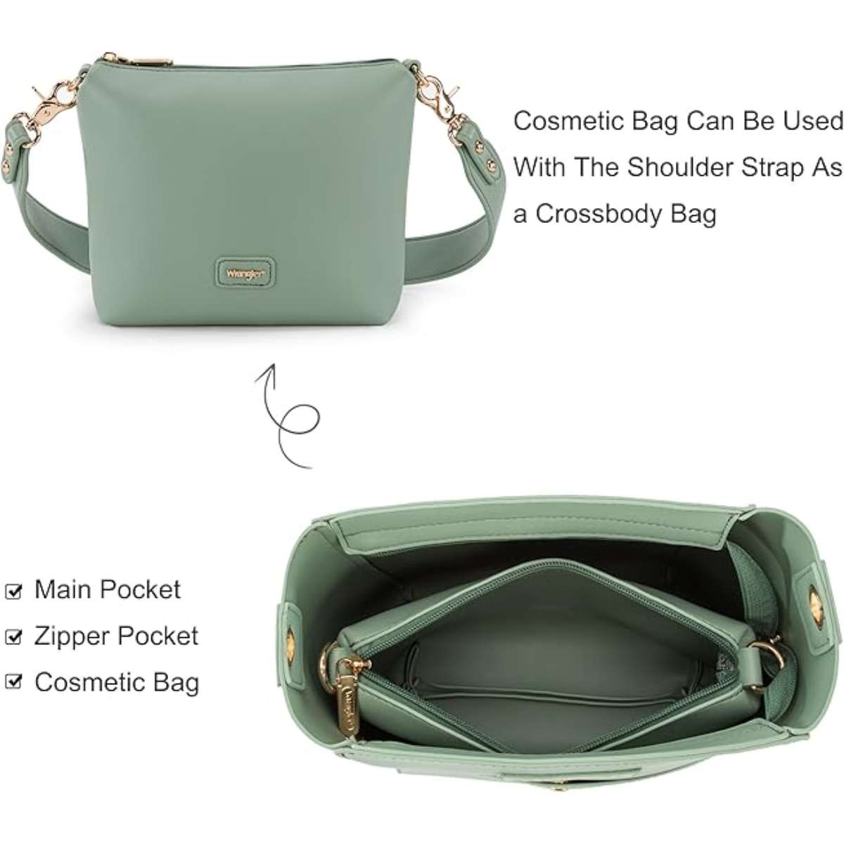 Wrangler purse with 1 main pocket, 1 detachable cosmetic bag with zipper, encapsulated bucket bag with magnetic clasp design.